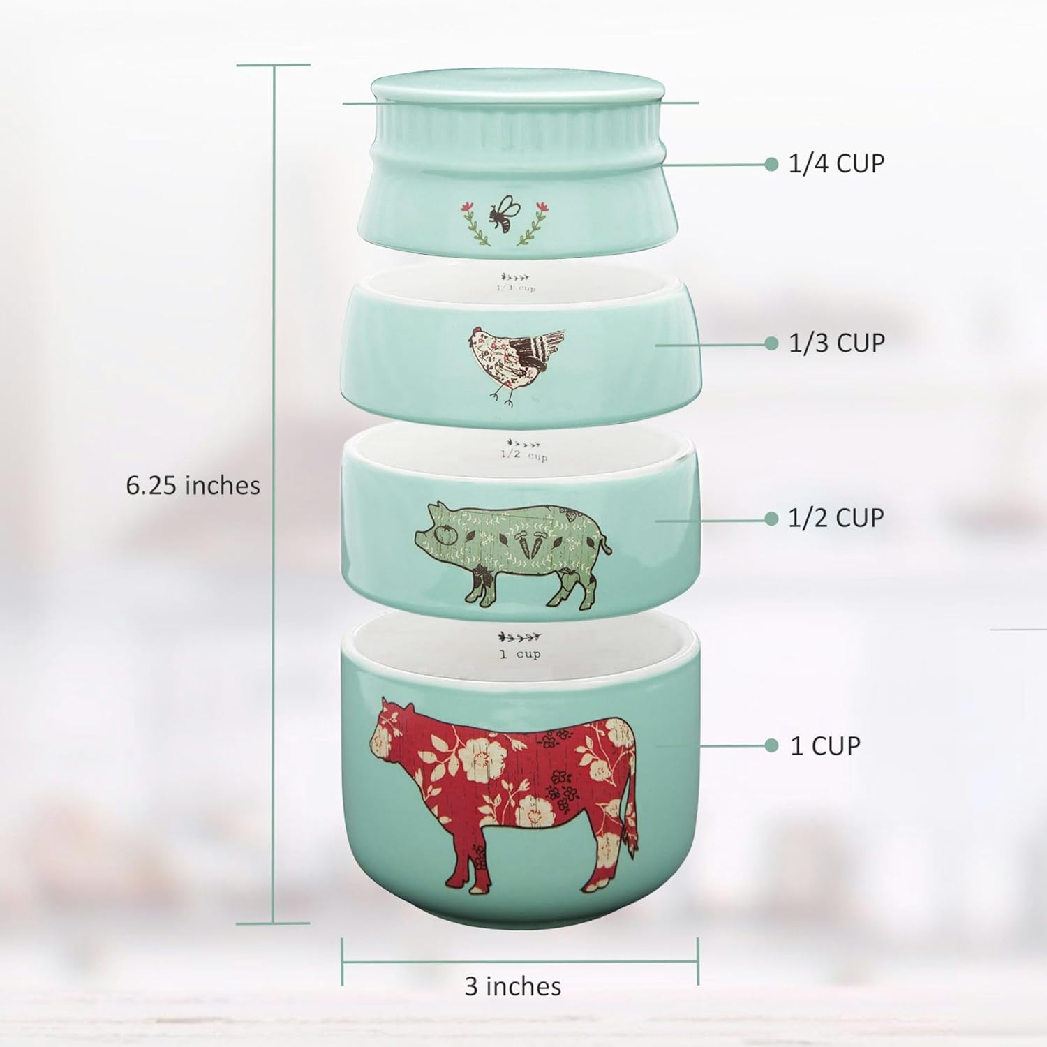 - Crafted with Care: Features 8 oz stackable measuring cups as a functional, delightful kitchen display - designed by Amylee Weeks. Securely packaged in a box, it comes with 1/4 cup, 1/3 cup, 1/2 cup, and 1 cup.