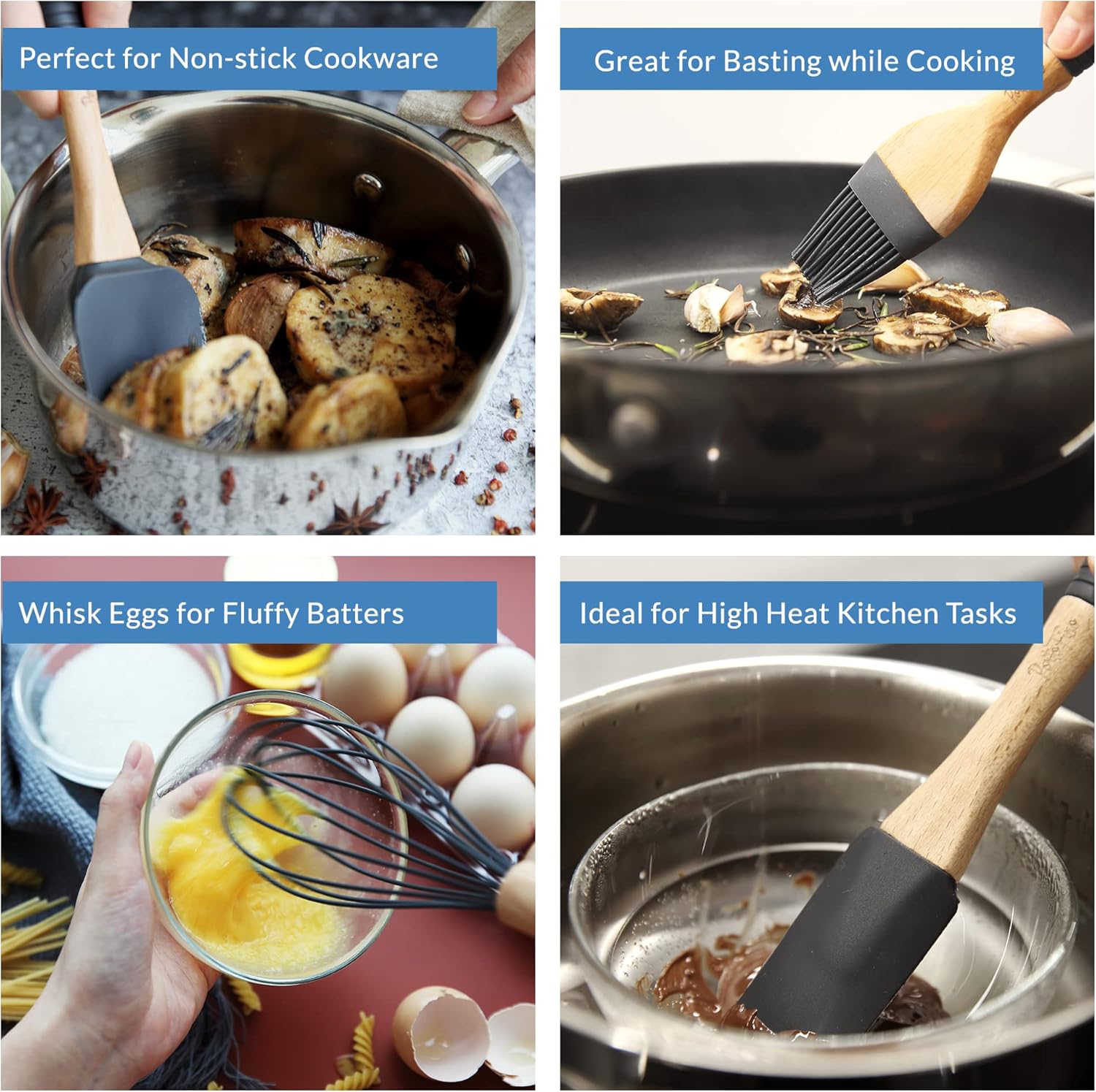 - IDEAL KITCHEN GIFTS - Looking for the ideal kitchen gifts or kitchen accessories? Our silicone rubber spatula set includes a small silicone spatula, a medium silicone spatula, a large spoon silicone spatula, a flat pastry brush, a round pastry brush, and a silicone-coated balloon whisk. Our kitchen utensils set is ideal for cooking delicious meals, hand-mixing batter for cookies and muffins, scraping mixing bowls and more. The perfect wooden spatula set and kitchen utensils for your family!