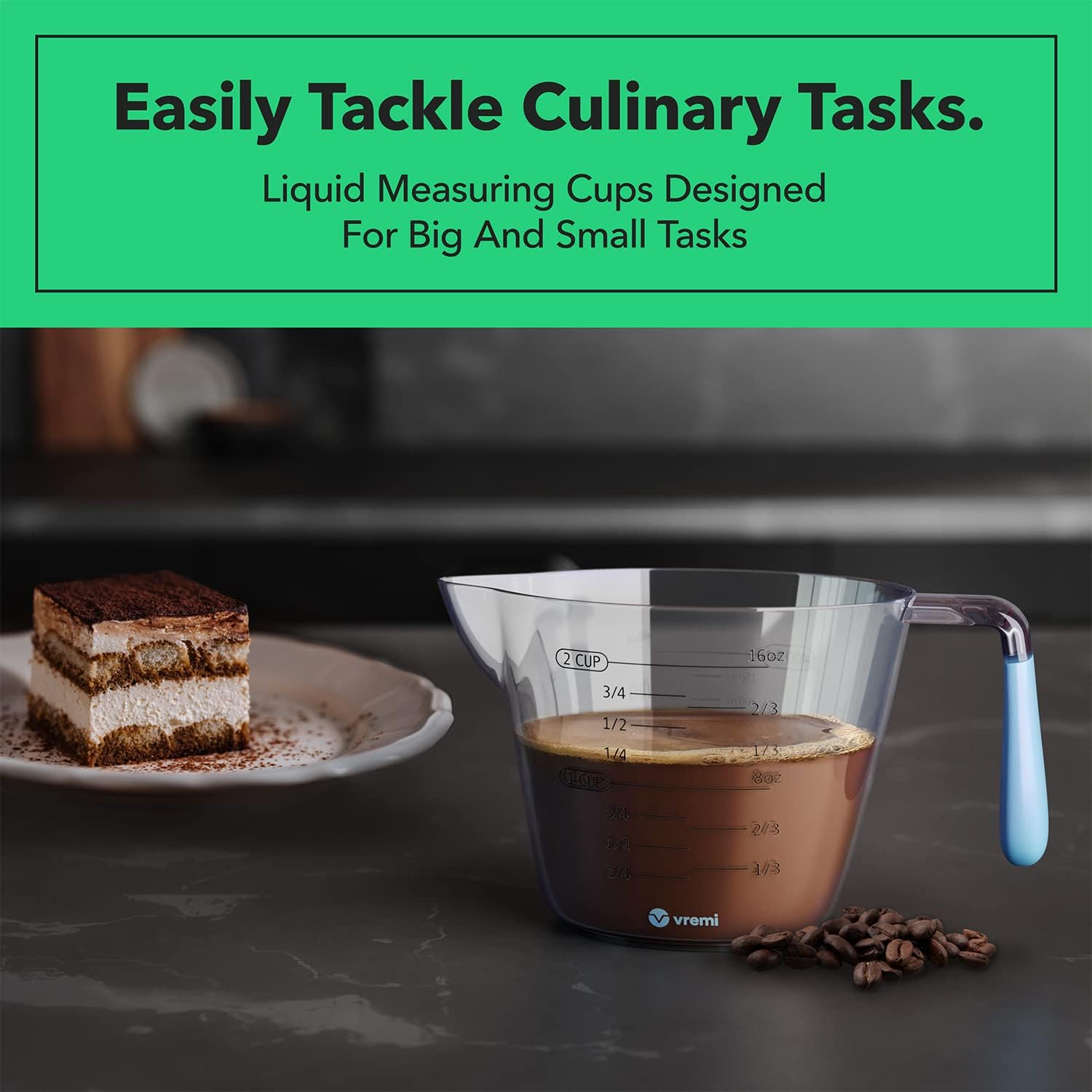 Vremi 3 Piece Plastic Measuring Cups Set - BPA Free Liquid Nesting Stackable Measuring Cups with Spout and Decorative Red Blue and Green Handles - includes 1, 2 and 4 Cup with Ml and Oz Measurement