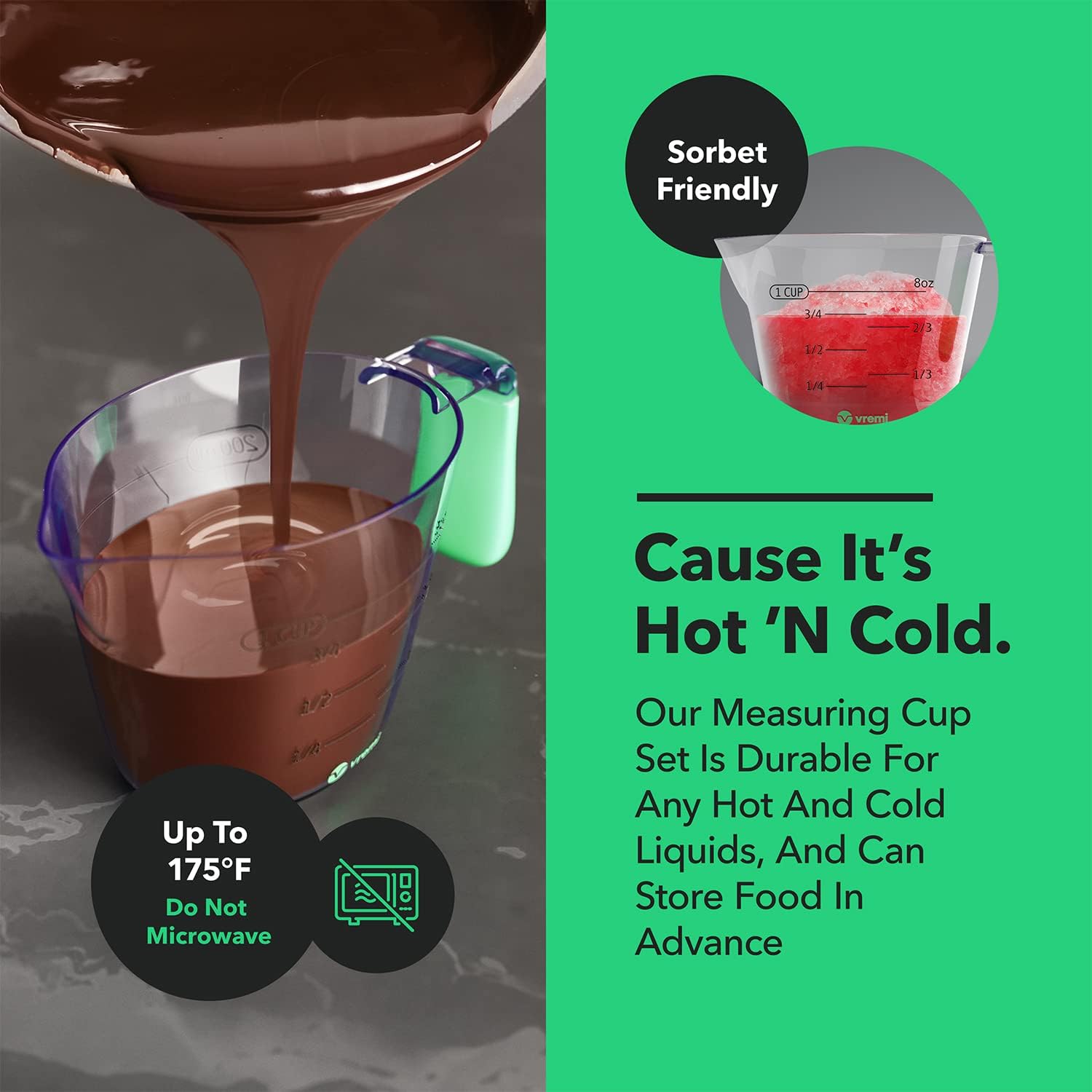 - Each lightweight and heat resistant measuring cup features an ergonomic, non-slip, silicone handle in red, blue or green for excellent control while pouring of water, cooking oil, vinegar and EVOO – all with no spills