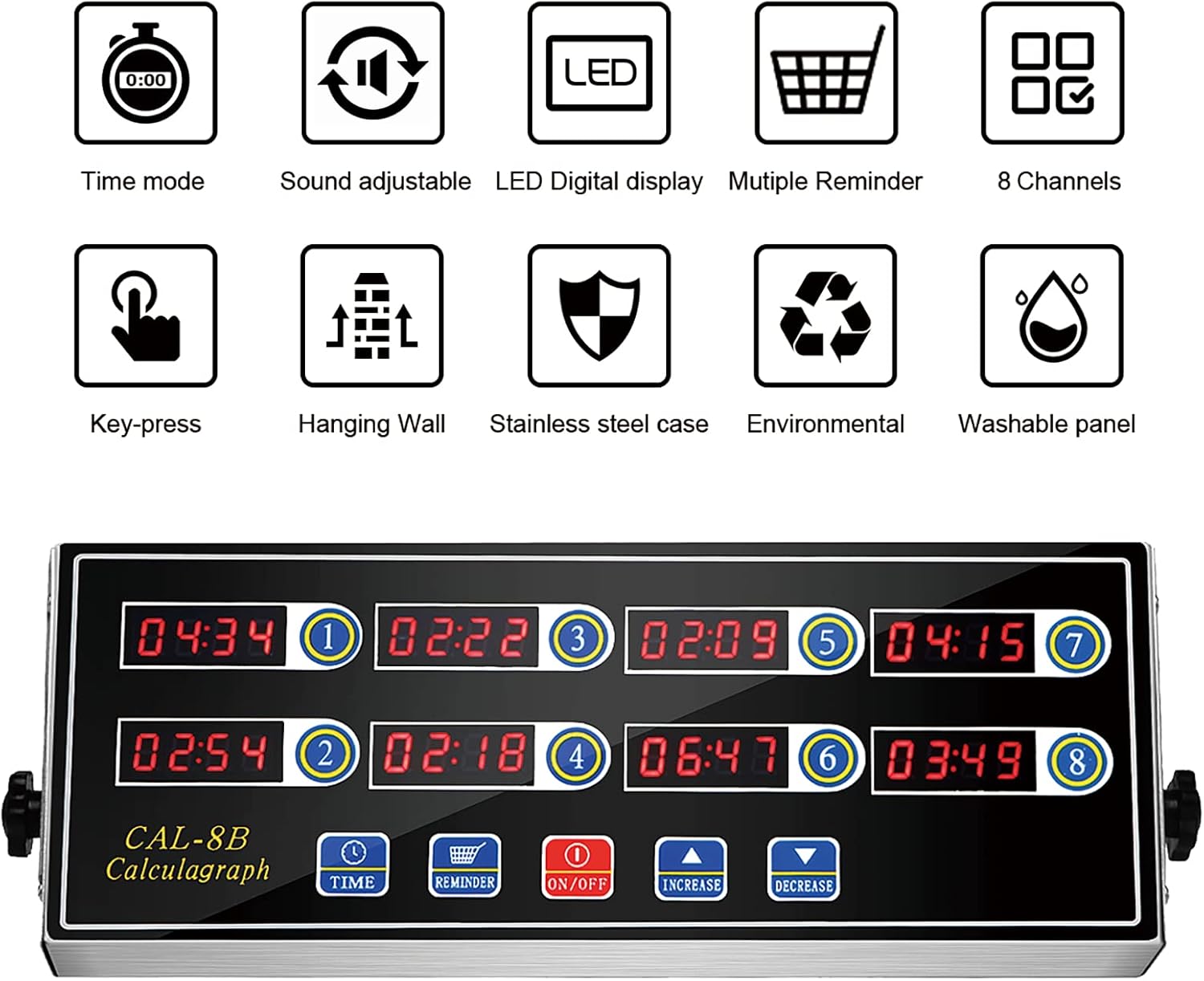 Kitchen Timers for Cooking, 8 Channel, Commercial Grade, Stainless Steel, LED Digital, Loud Alarm,