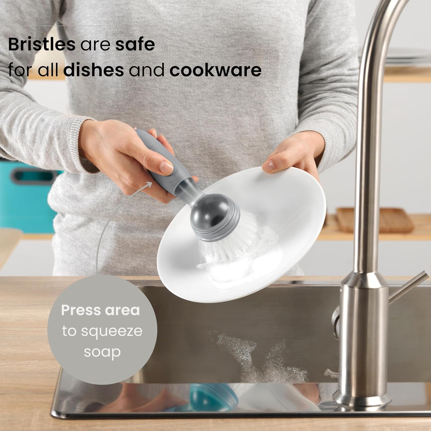 Vigar Rengo Soap Dispensing Dish Brush, Dish Brush with Soap Dispenser for Pot Scrubber, Dishes, Sink Cleaner, and Kitchen Essentials, Grey