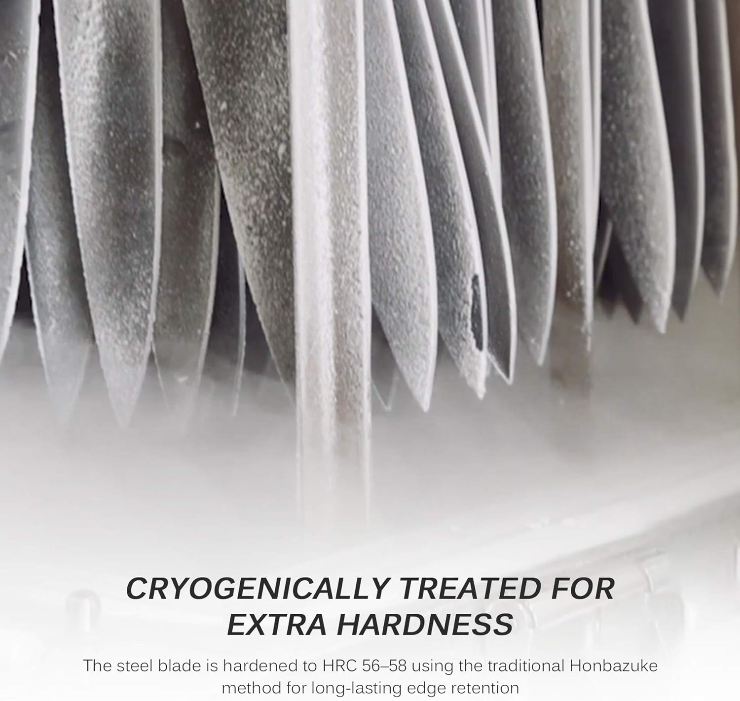 - EXTREME SHARPNESS: The ruthlessly sharp edge is handcrafted by seasoned artisans to a mirror polish at 13-15° per sided using the traditional 3-step Honbazuke method; cryogenically treated for incredible hardness, flexibility, and corrosion resistance.
