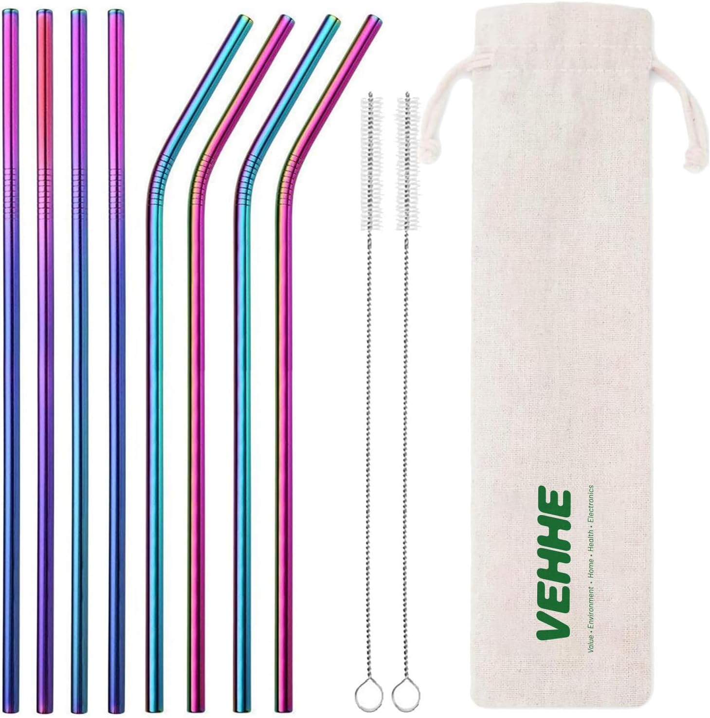 VEHHE Metal Straws Drinking Straws 10.5" Stainless Steel Straws Reusable 8 Set - Ultra Long Rainbow Color-Cleaning Brush for 20/30 Oz for Yeti