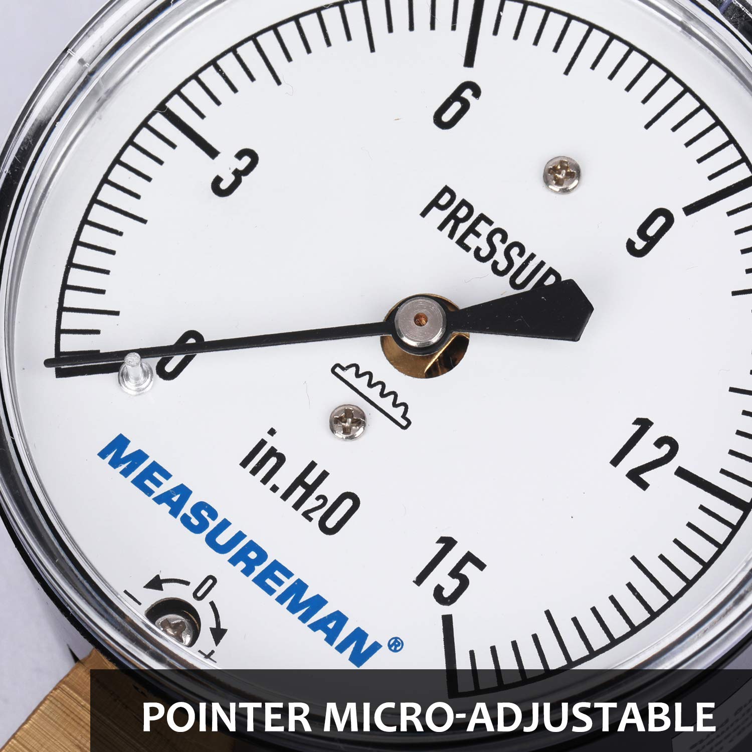 MEASUREMAN Diaphragm Type Capsule Low Pressure Gauge, 2-1/2" Dial, 1/4" NPT Lower Mount, Adjustable, 0-15 in H2O(Inches of Water)