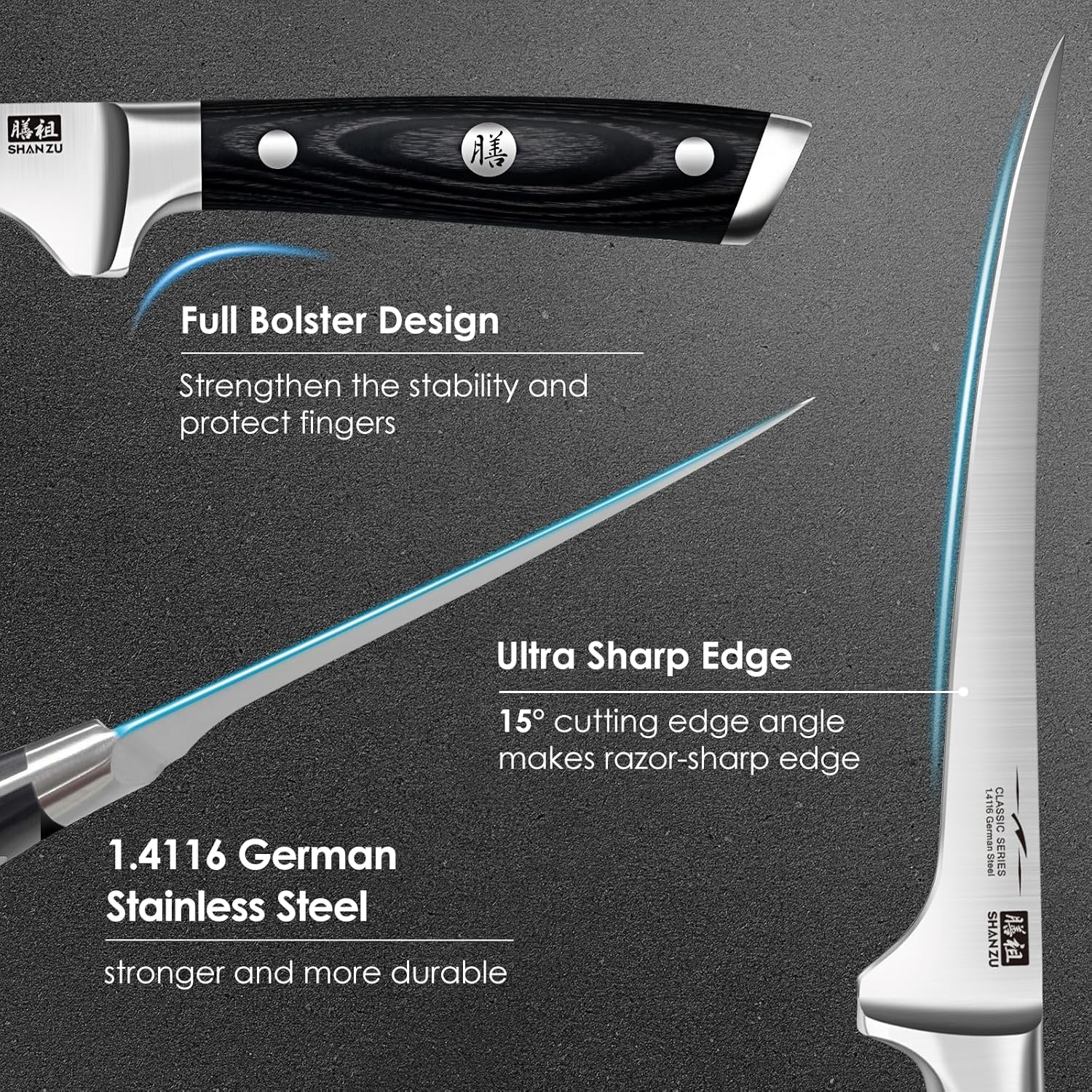 SHAN ZU Fillet Knife 7 Inch- Edge Deboning Fish and Meat Boning Knife, Professional Super Sharp Fish Knives Made of German Stainless Steel Boning Knives with Full Tang Handle