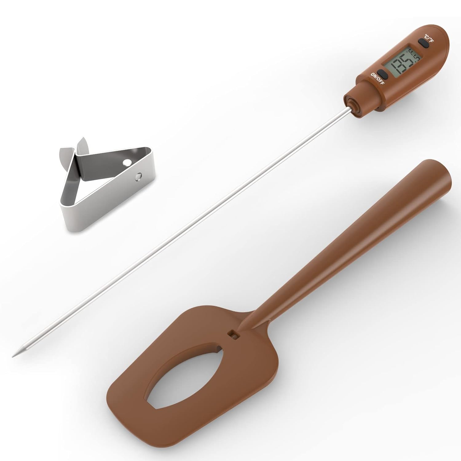 - Multipurpose Digital Candy Spatula Thermometer: This Candy Thermometer for Candy Making is with a SS Clip to clamp to the edge of pot. This spatula thermometer is with 12 inch probe, which can easily to use multi place, such as a candy making,bbq cooking.Measuring the temperature of Chocolate, Liquid Candy, Deep-fry, Sauce, Syrup, Meat & More