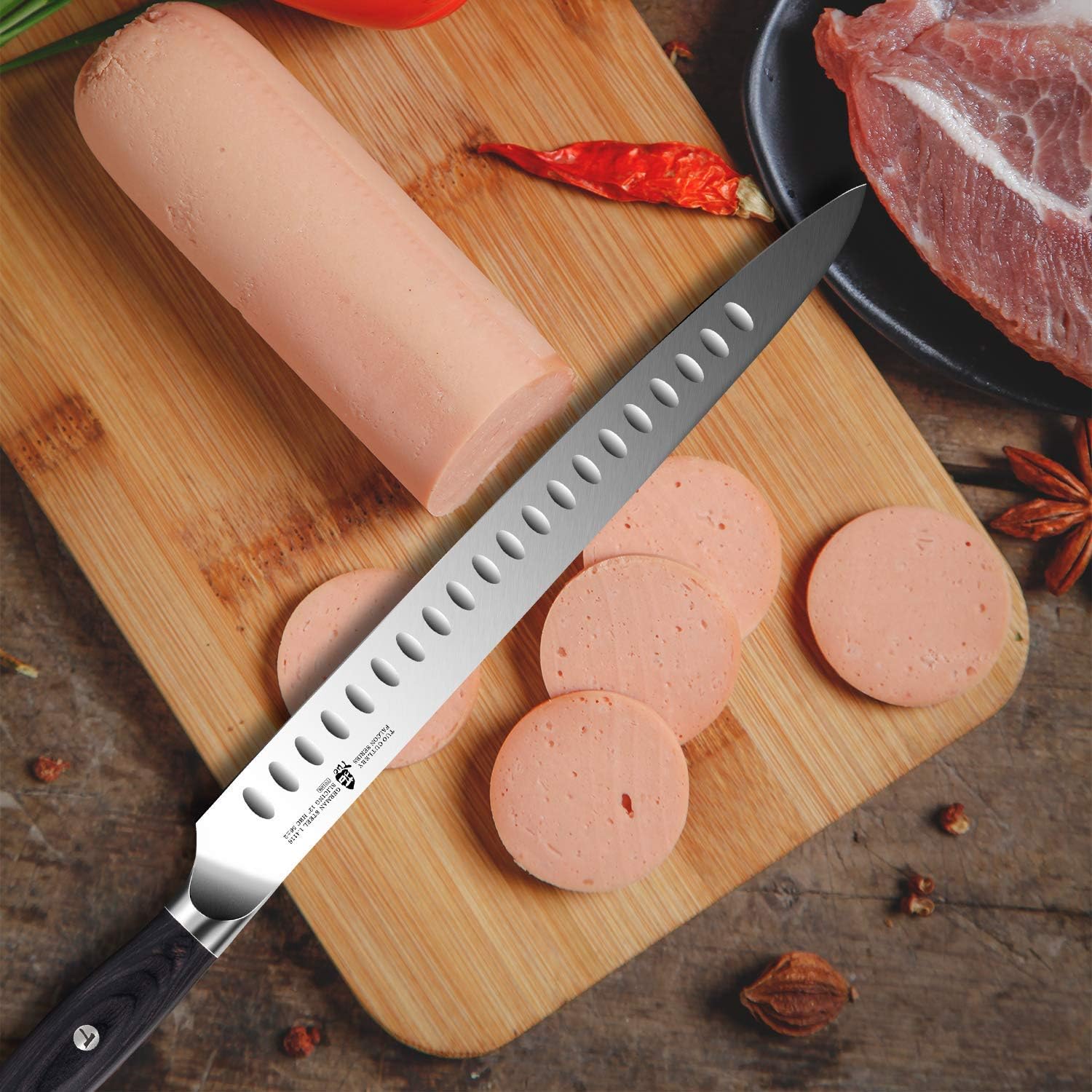 - š„©ćWIDELY USEćThis 12 inch slicing knife can be used for all kinds of food. Its length is suitable for carving large pieces of roast, ham, turkey, multi-tiered fruit cake, large fruits, thick vegetable and much more.