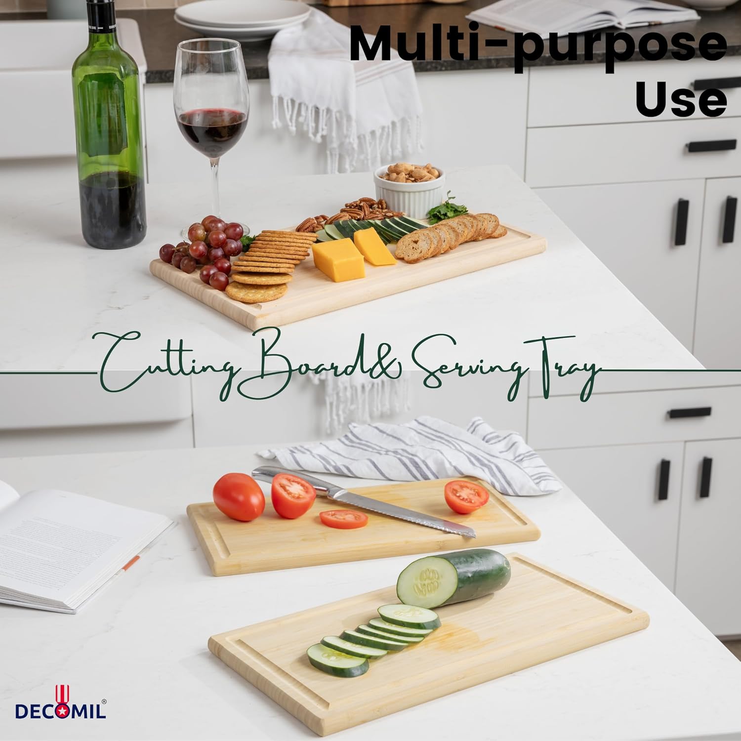 - šVersatile Cutting and Serving Board: Our cutting board, crafted from NATURAL ORGANIC BAMBOO, is designed to do more than just chopping meat. It excels at slicing bread, fruits, vegetables, meats, steaks, and cheeses, making it a true multitasker in the kitchen. Additionally, it doubles as an elegant serving board, perfect for presenting a variety of culinary delights.
