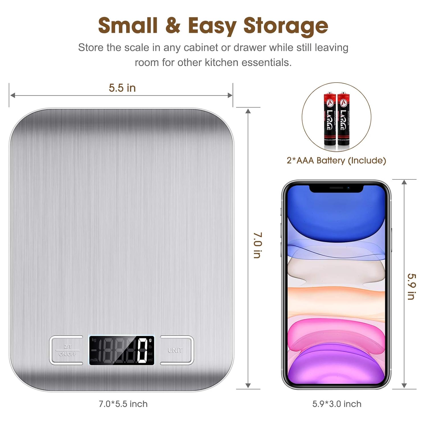 - 【Compact Sleek】Stainless-steel digital scale is designed with food-grade 304 stainless-steel platform for easy cleaning and maintenance, the digital kitchen scale’s convenient size makes it easy to store in your kitchen.