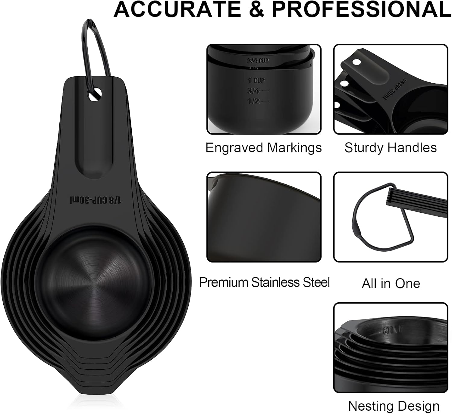 Stainless Steel Measuring Cups, Wildone Metal Measuring Cups Set with Easy to Read Markings for Measuring Dry or Liquid Ingredients, Set of 7 (Black)