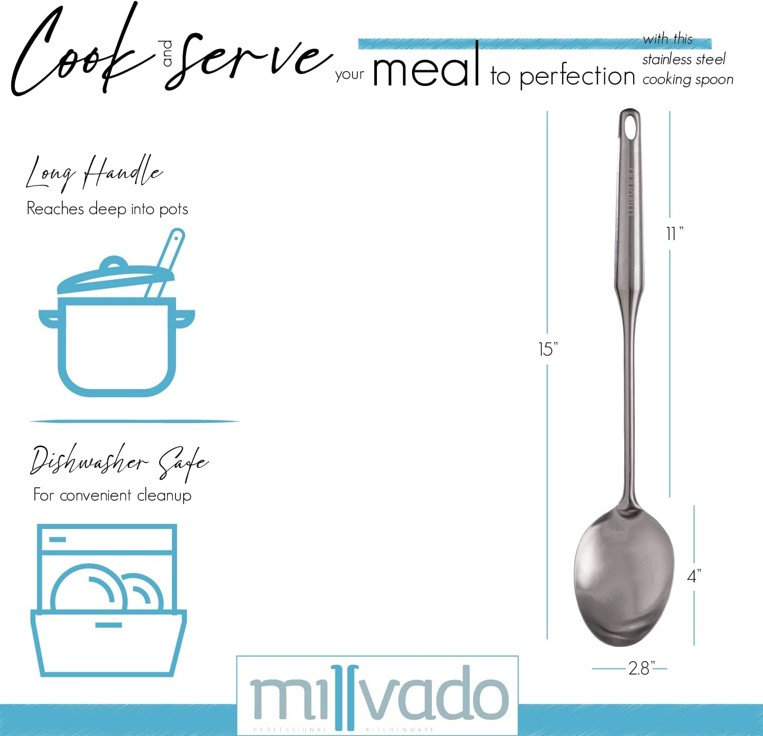 Stainless Steel Big Cooking Spoon, Kitchen Utensils and Gadgets, 15 Inch Large Spoon For for Cooking, Basting, Serving, Dishwasher Safe Metal Utensil, Durable, Solid Construction