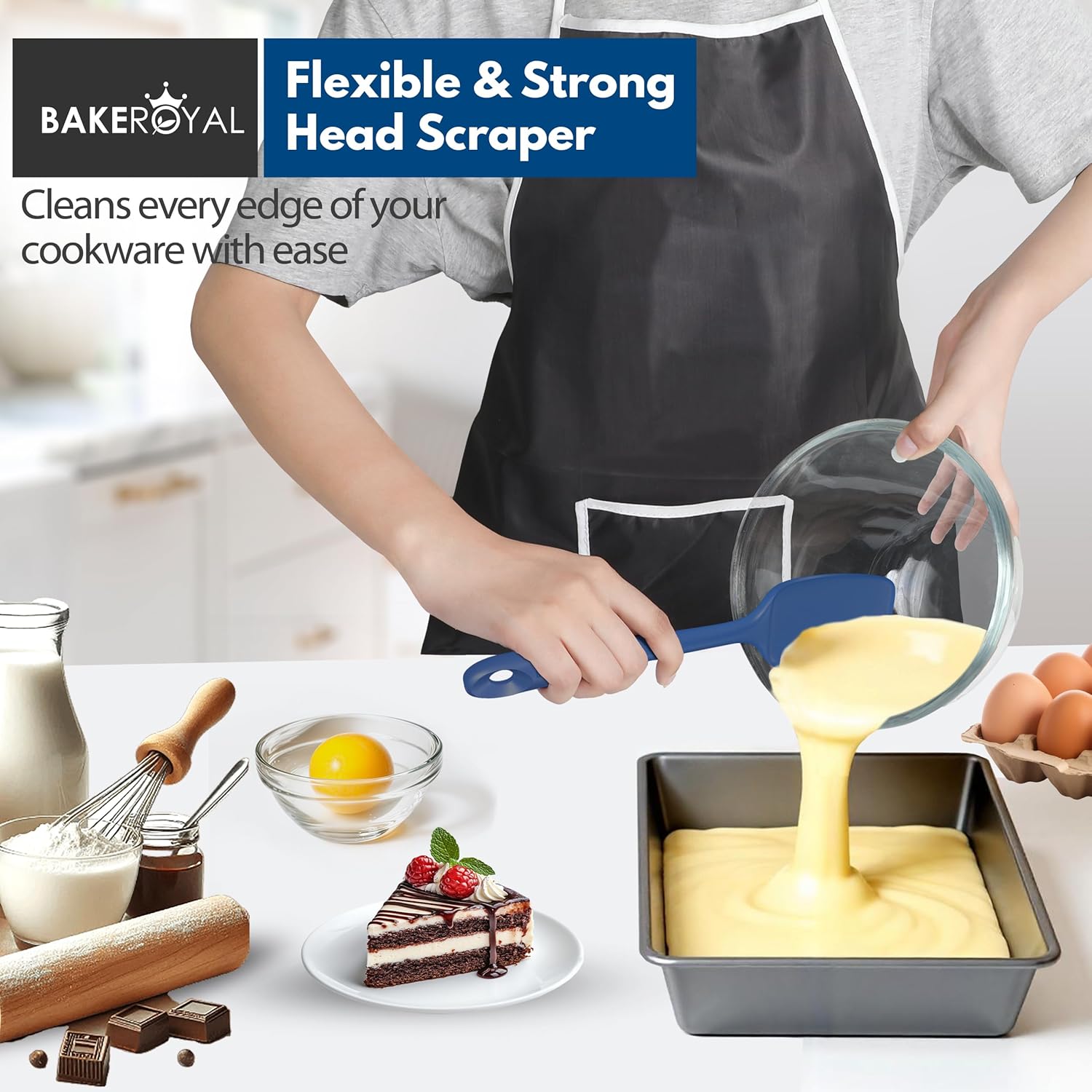 - ROYAL TASTE MAKER: This Bake Royal rubber spatula set includes Large, Mini, Spoon, and Jar are the best minimalist kitchen essentials that come with every spatula a new or experienced baker could need to whip up some delicious food. From frosting cakes, scraping batter, Heavy sticky and soft mixing, butter icing, flipping pancakes, scooping dough, to getting the last bit out of the jar done with these well-balanced, functional, and stylish tools that also add a pop of color to your kitchen.