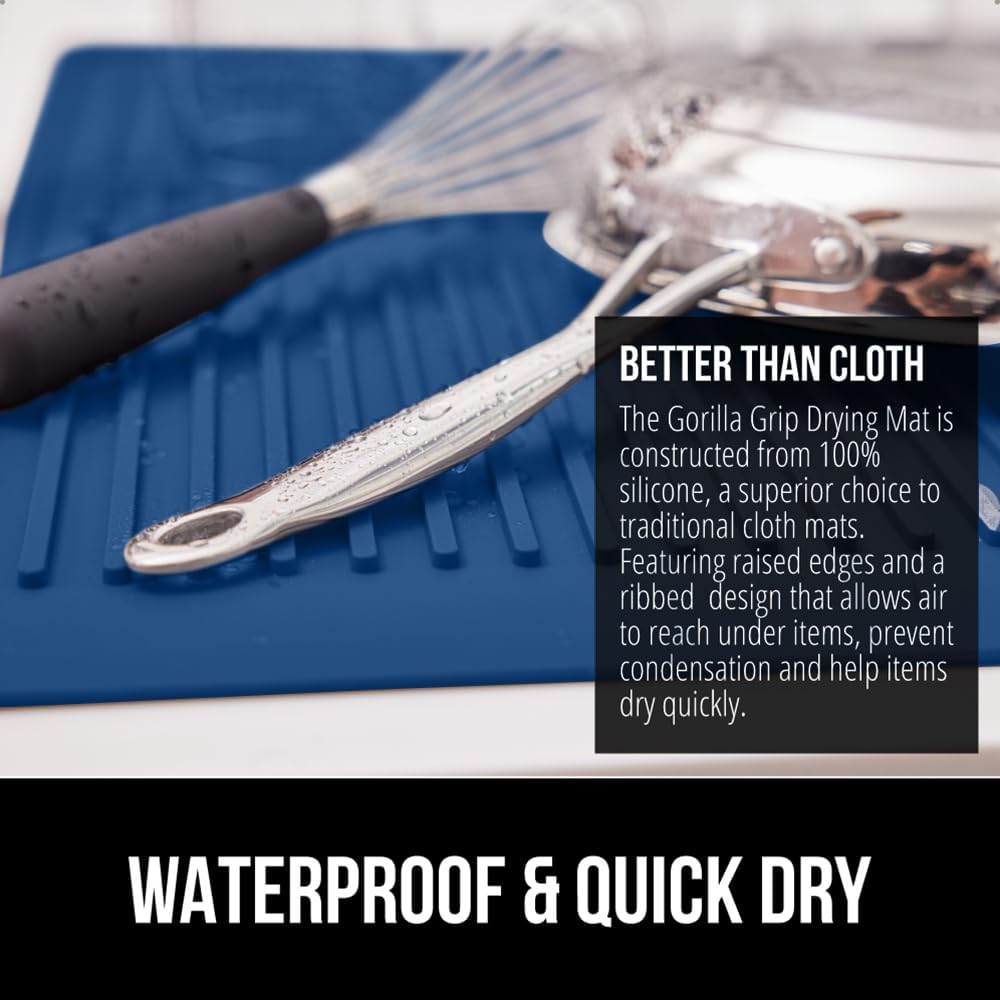 GORILLA GRIP 100% BPA-Free Patented Silicone Dish Drying Mat for Kitchen Counter, Water Catching Ribbed Design, Easy Clean Waterproof Sink Liner, Heat Resistant, Fits Under Rack, 13x11 Inch, Blue