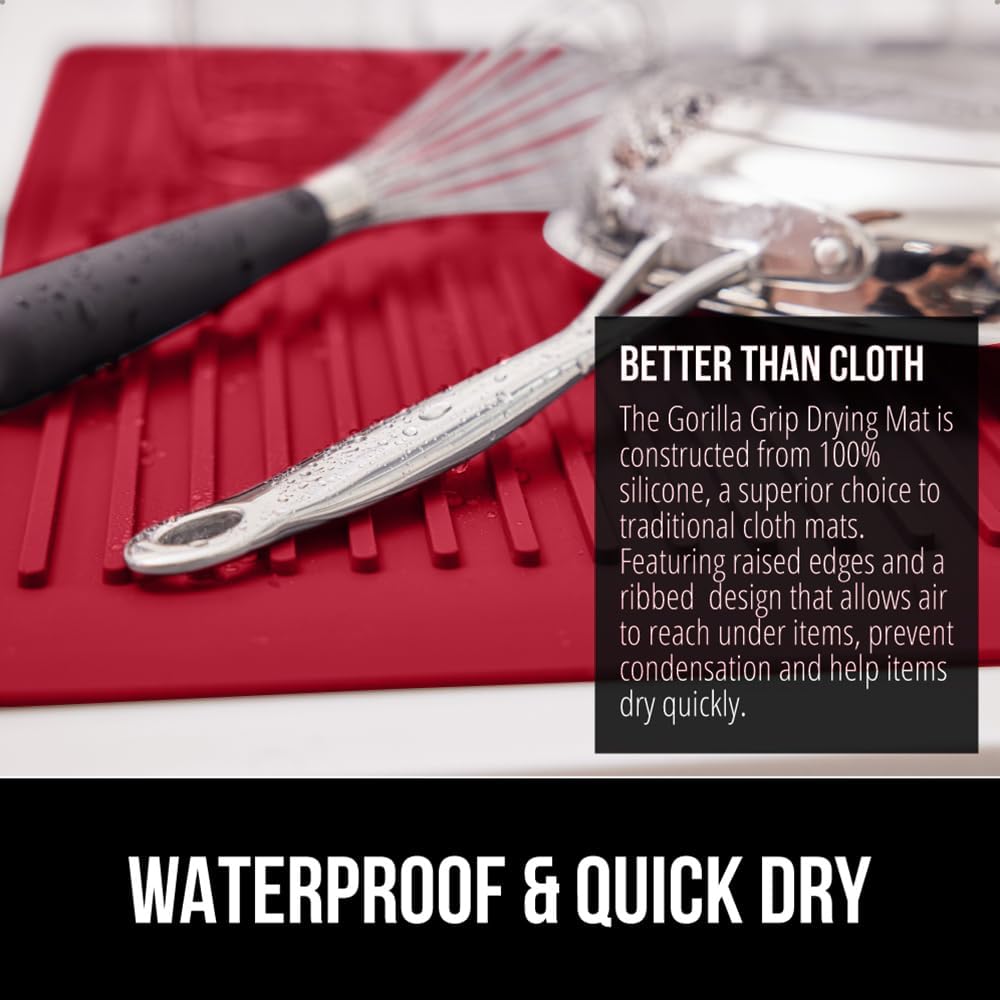 GORILLA GRIP 100% BPA-Free Patented Silicone Dish Drying Mat for Kitchen Counter, 18x24 Inch, Water Catching Ribbed Design, Easy Clean Waterproof Sink Liner, Heat Resistant, Fits Under Rack, Red