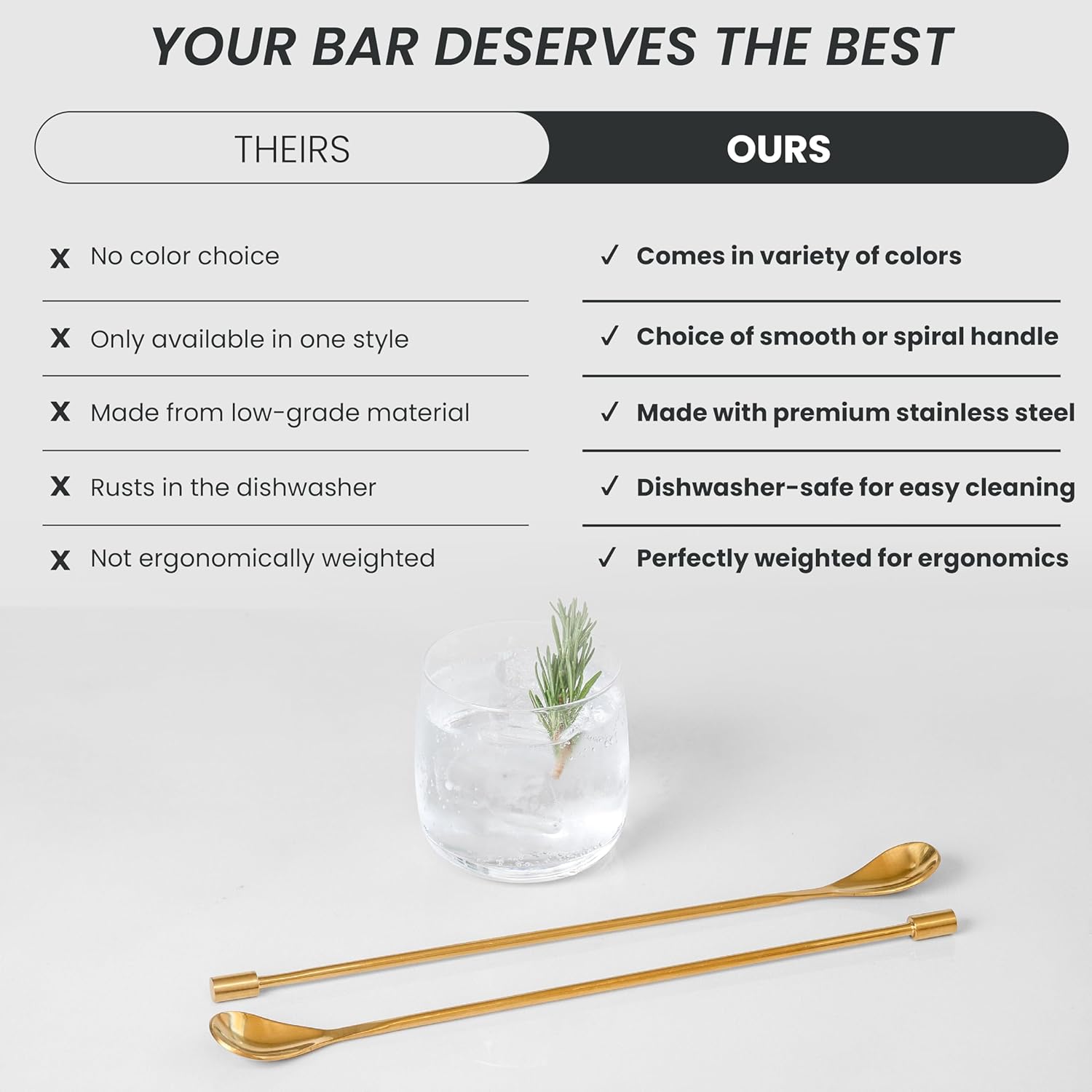 - STAINLESS STEEL STIRRERS FOR PRECISION MIXING: Designed by a career bartender, this 12-inch drink spoon set includes one spiral and one smooth handle for versatile stirring. Made for speed, accuracy, and balance, the ergonomic shape feels natural in the hand, making this the go-to tool for mixing cocktails in a shaker, mixing glass, or pint.