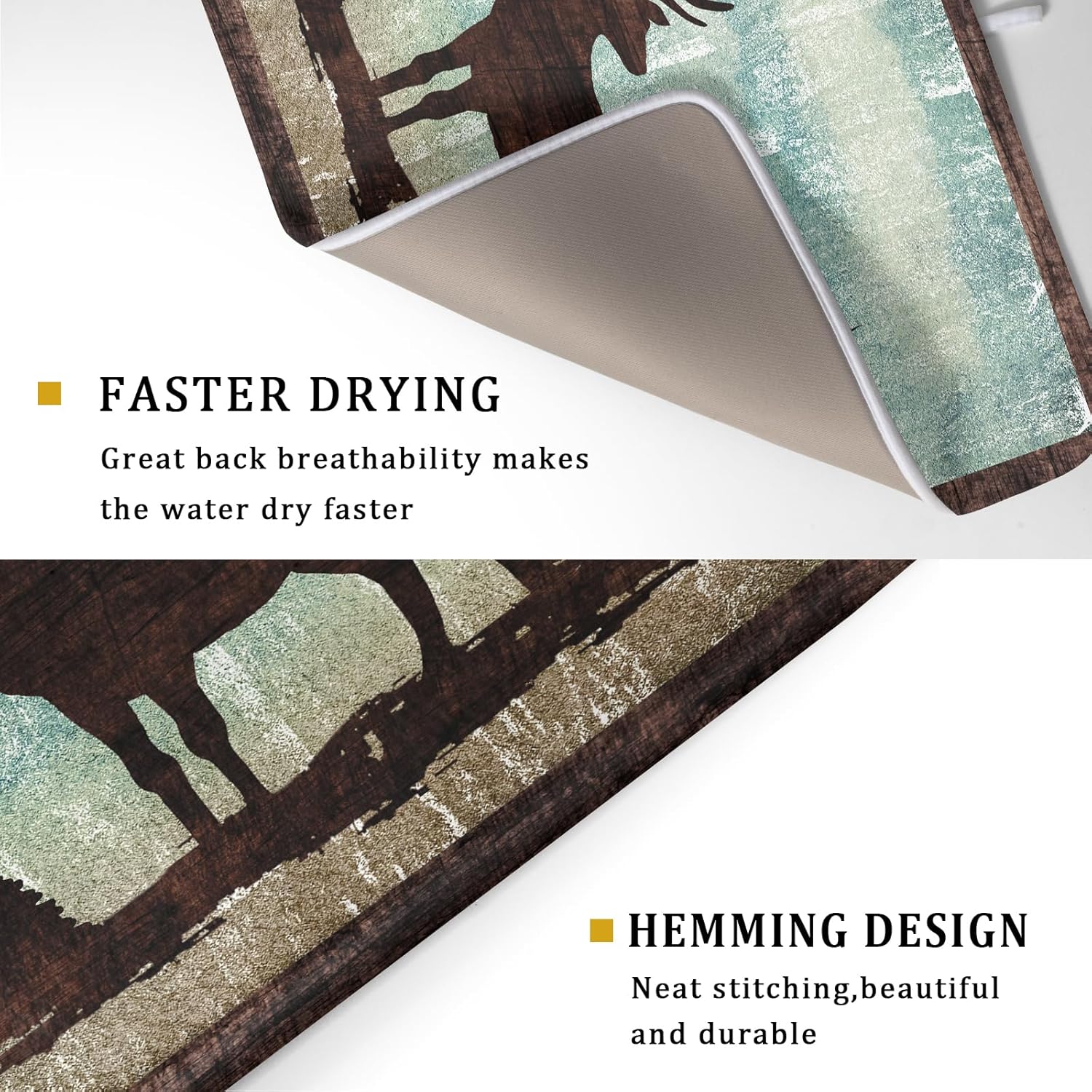 - ❀ 【HIGHLY ABSORBENT, QUICK DRYING】 With the middle made of composite sponge, microfiber terry cloth on the reversible side absorbs 4X its weight in water, which easily keeps your counter dry. Use alone or pair with a dish drainer. Our ultra absorbent Elk Moose Silhouette Dishes Pad will suck up all the left wetness from your pots, pans, and dishes, and leave the underside both dry. Our slip-resistant backing adds stability when drying stemware or other delicate items.