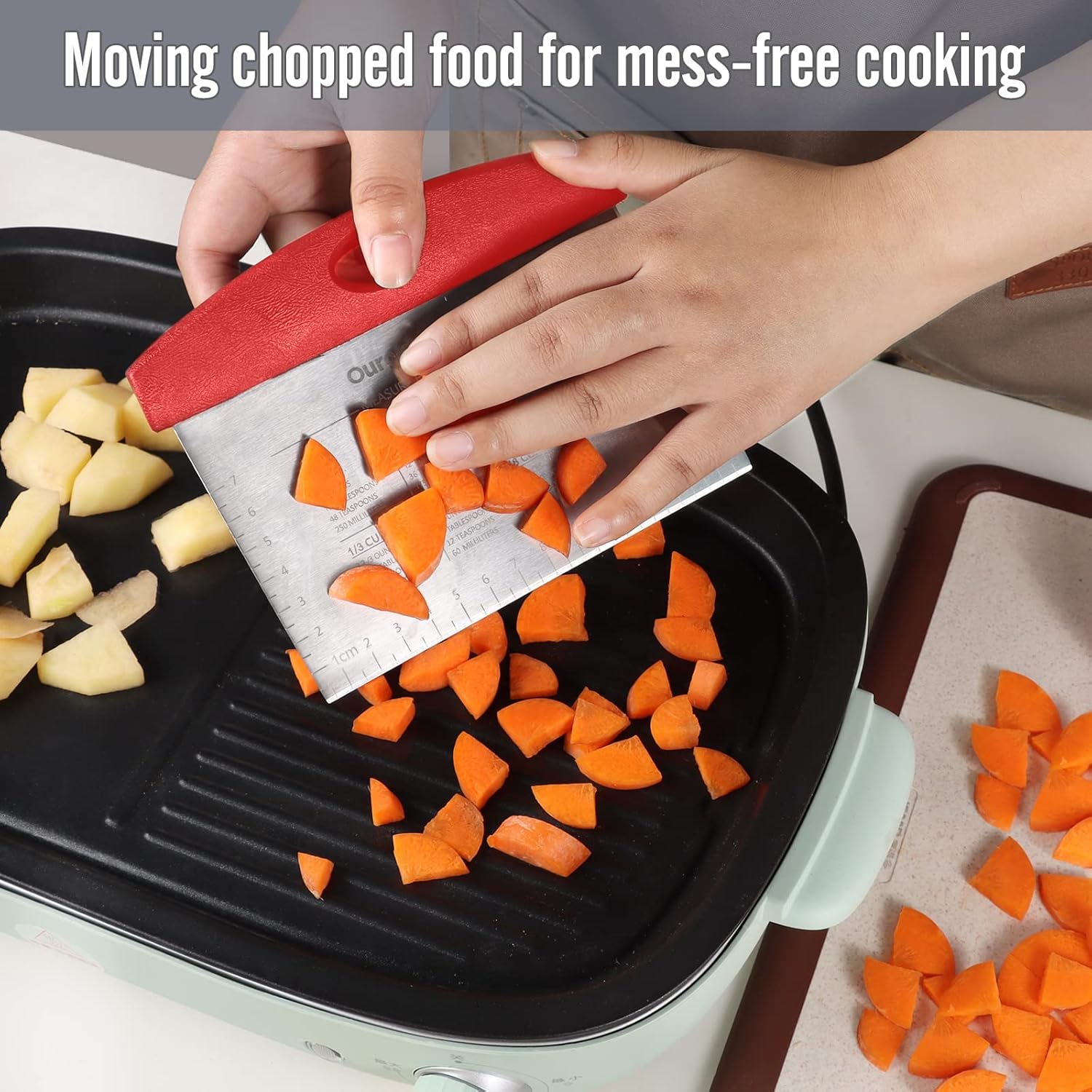 - Multipurpose dough scraper: Whether you’re dividing pastry dough, slicing pizza, chopping even the hard veggies, smoothing cake, or scooping up chopped veggies from the board, it can complete tasks like a charm