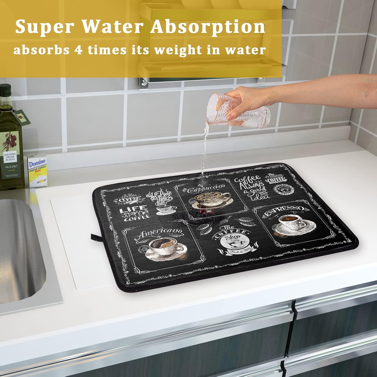 - ❀ 【SPECS & WATERPROOF BACKING】 Made of absorbent fabric, this 3-ply polyester provides a soft cushion. 24" X18", fitting most counters snugly while providing a smart and sharp look, a gorgeous decoration for kitchen. Moreover, the waterproof backing stops liquids from soaking through, damaging or staining the surface below and allows moisture to evaporate quickly at the same time.