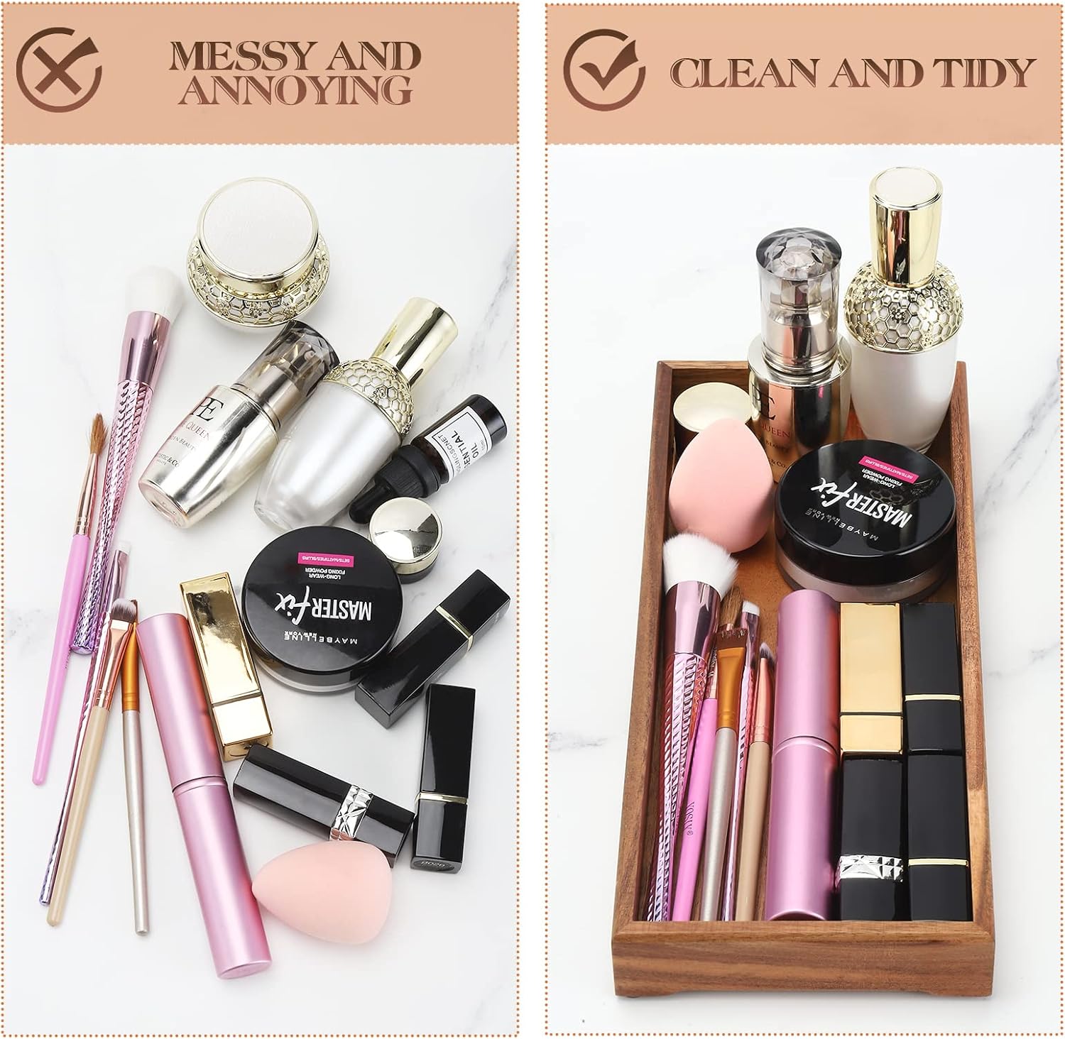 - SAVE SPACE: A wooden tray brings order and elegance anywhere in your lovely home. Set it on the toilet tank top, dresser, vanity, end table, kitchen, nightstand or desk in your house, to cut the countertop clutter, keep all your favorite items organized and within easy reach.