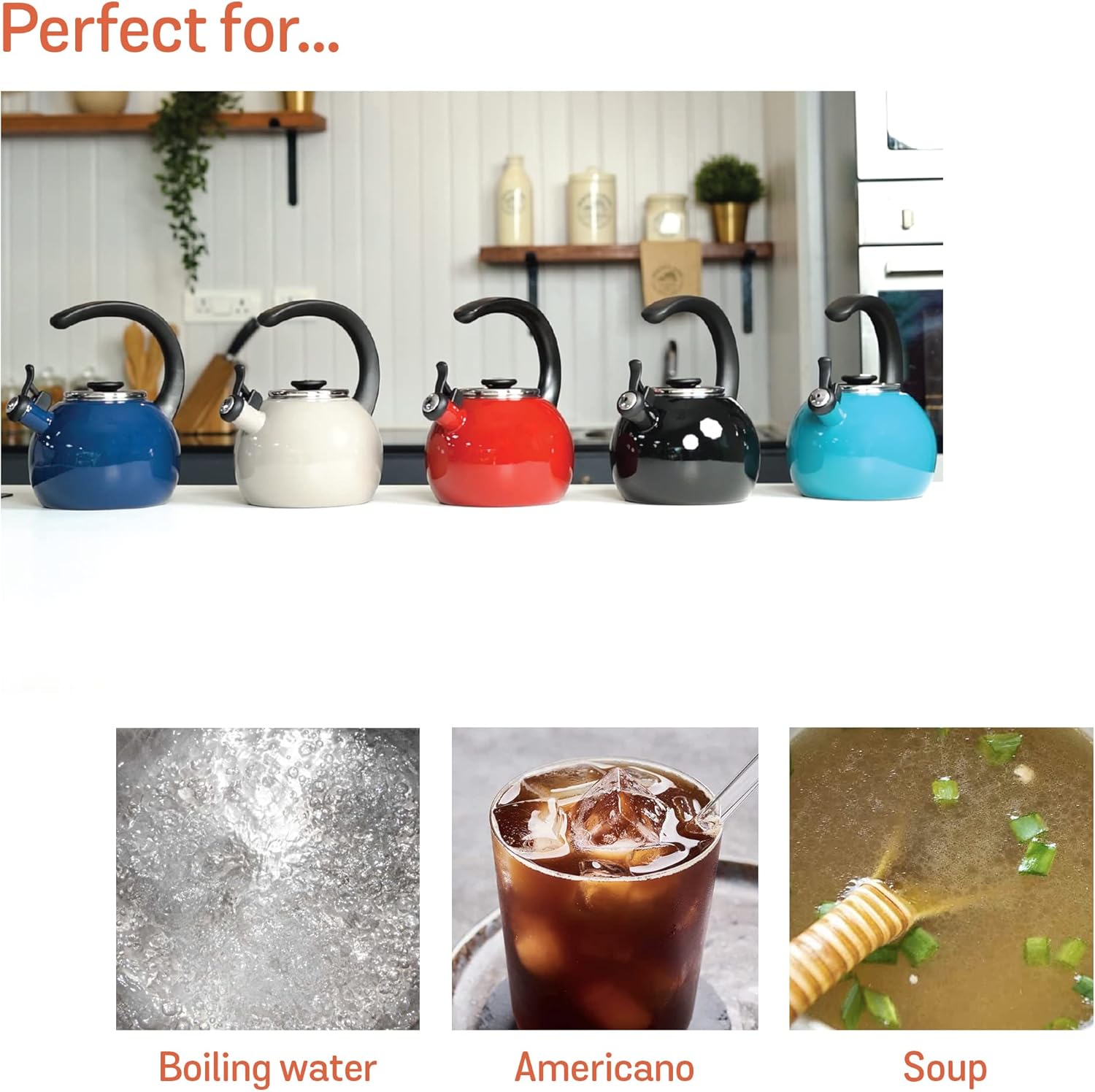 - PERFORMS BEAUTIFULLY: Stylish, enamel on steel teakettle provides long-lasting durability with a stain-resistant exterior that looks and performs beautifully for years of hot beverage enjoyment
