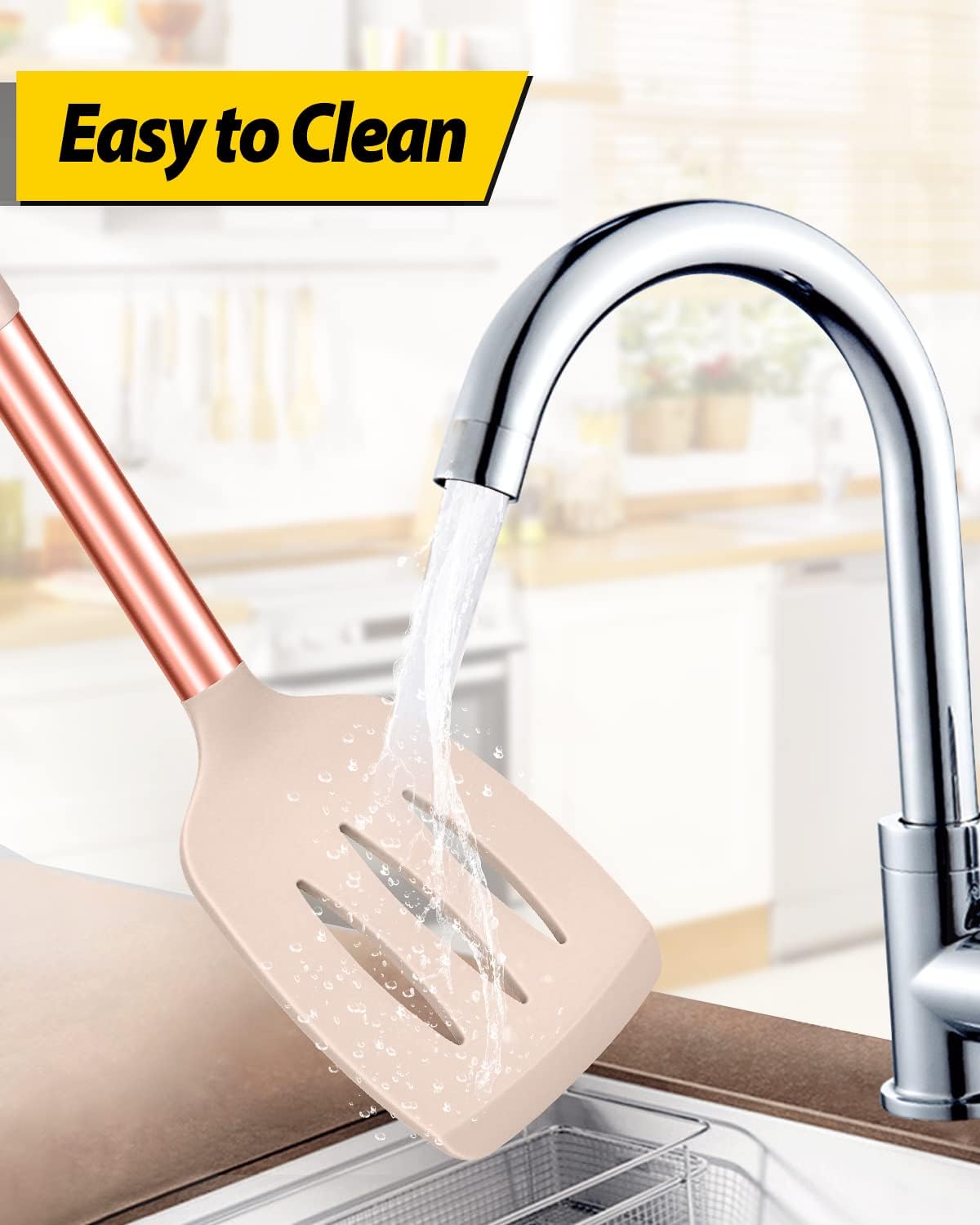 - Widely Used : Thin and flexible edge of the silicone turner is ideal for flipping,frying and turning food; Large capacity design of cooking spoon, used to hold food more convenient; Slotted Spoon can quickly drain the water