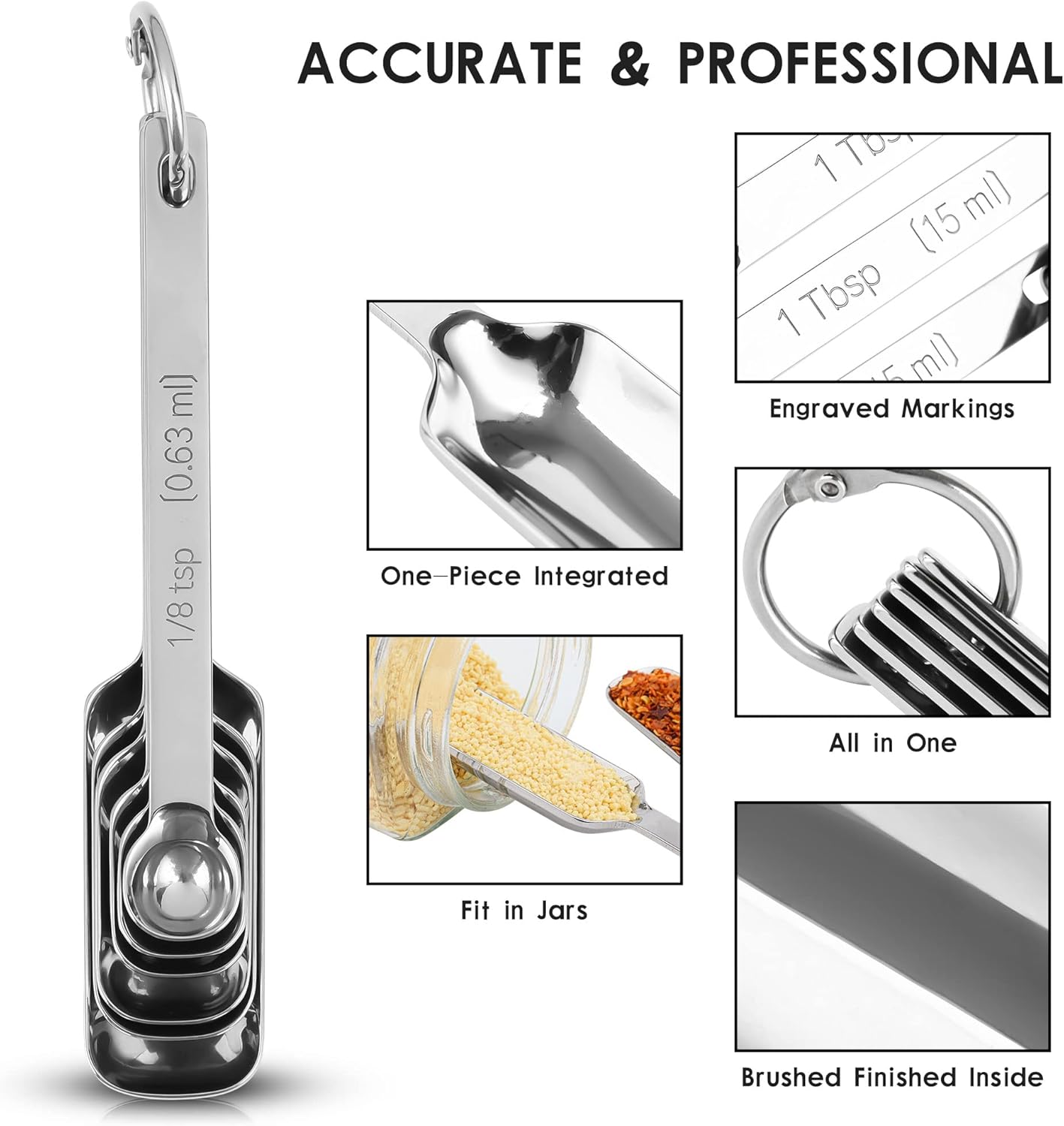 - ✱✱ Every stainless steel metal measuring cups and spoons set: this set has the accurate measurements size in US and Metric engraved on the handle clearly, what will help you reduce any measuring errors for cooking or baking! for dry measuring cups and liquid measuring cups in kitchen!