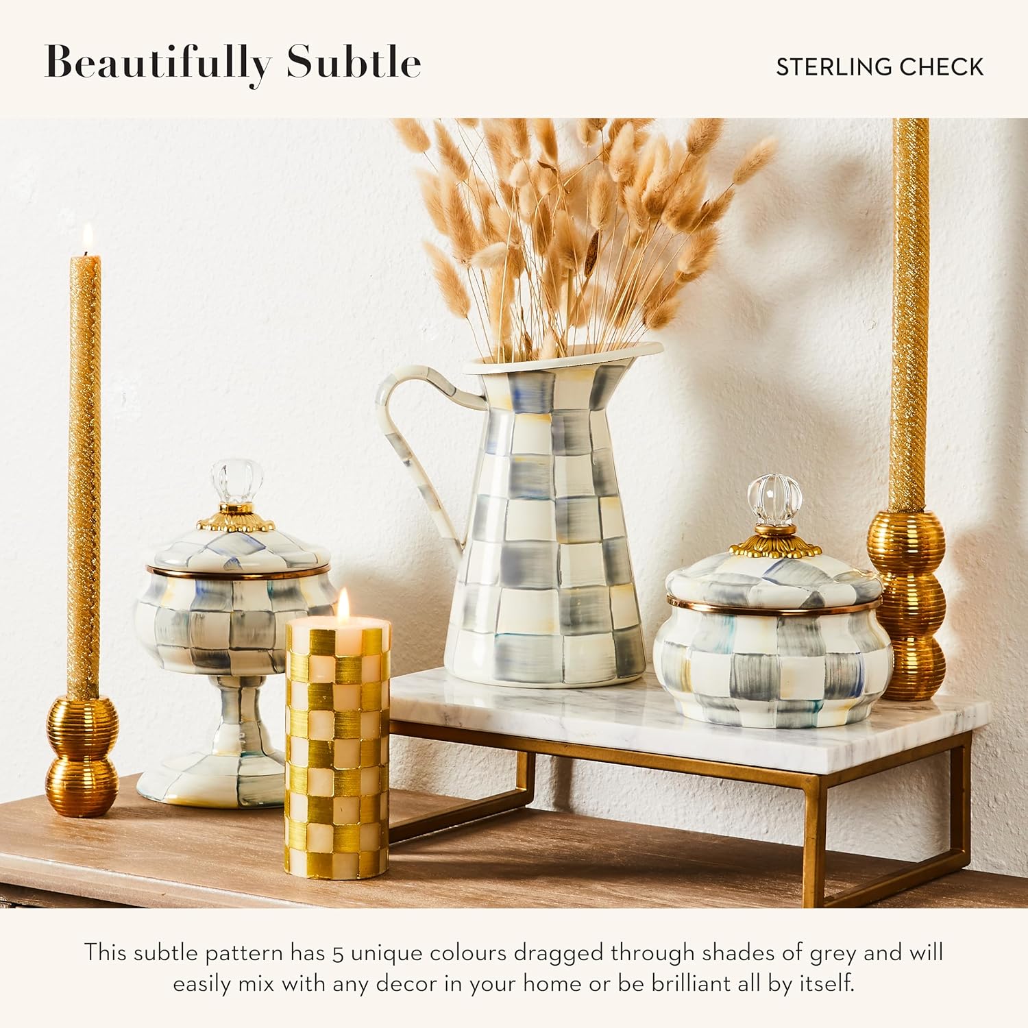- ELEGANT CHECKERED TEA KETTLE: Our iconic Sterling Check tea kettle adds panache to a whimsical tea set. The heavy-gauge steel underbody is glazed with hand-painted color-dragged checks in subtle shades of gray and topped with an elegant clear glass knob.