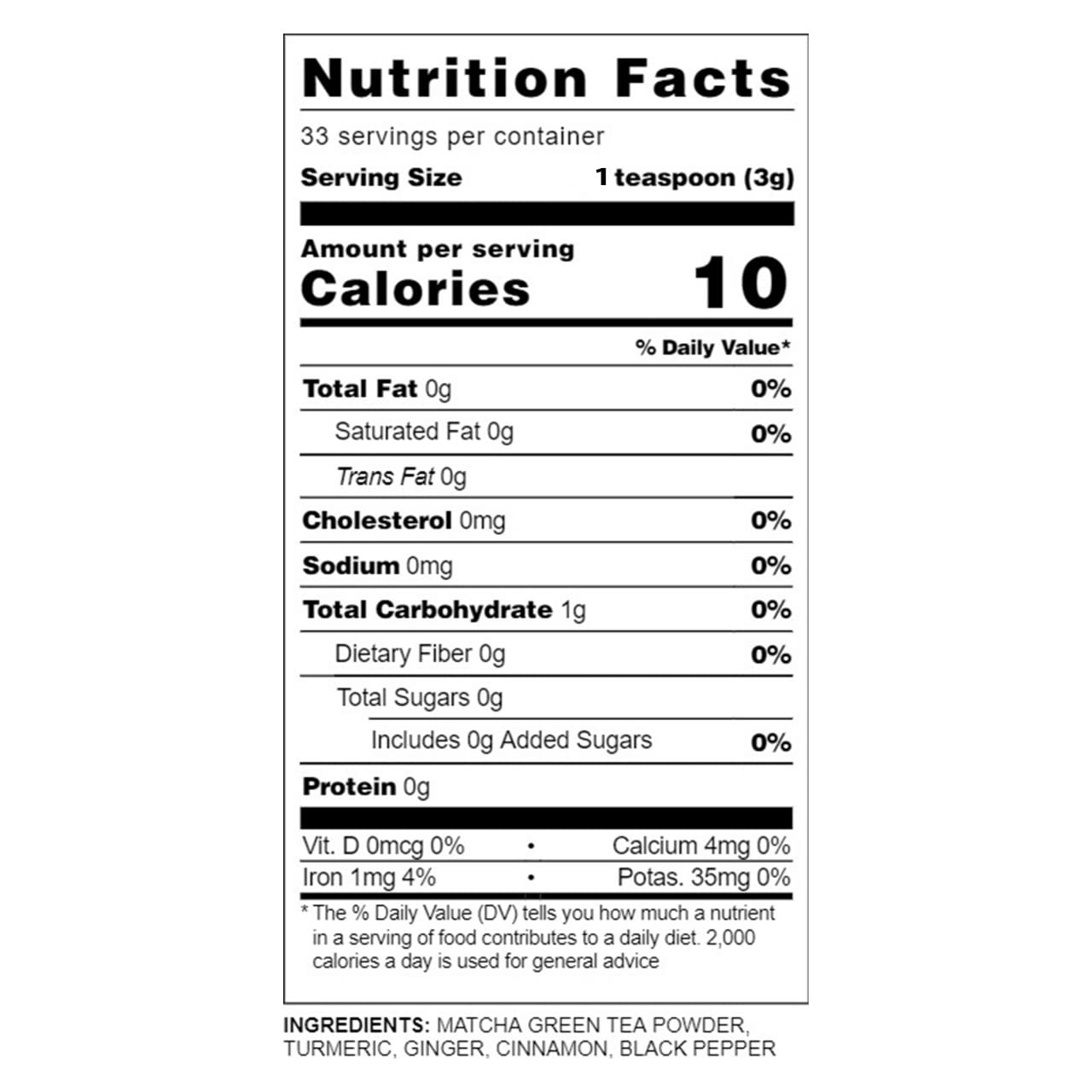 - SUPERFOOD BLEND – A nourishing fusion of matcha green tea, turmeric, ginger, cinnamon, and black pepper, rich in antioxidants and anti-inflammatory properties for optimal wellness.