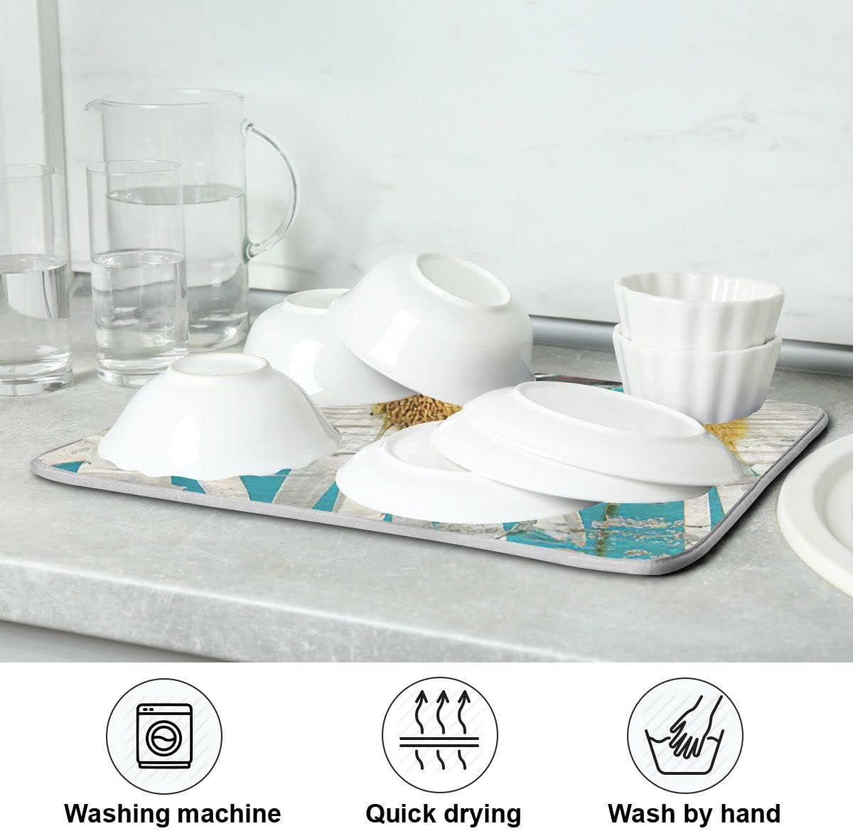 Daisy On Old Wooden Board Dish Drying Mat for Kitchen Counter Turquoise Wood Drying Mat 16 x 18 Inch with High Absorbent Reversible Microfiber Dish Drying Pad Drainer Mat for Coffee Bar