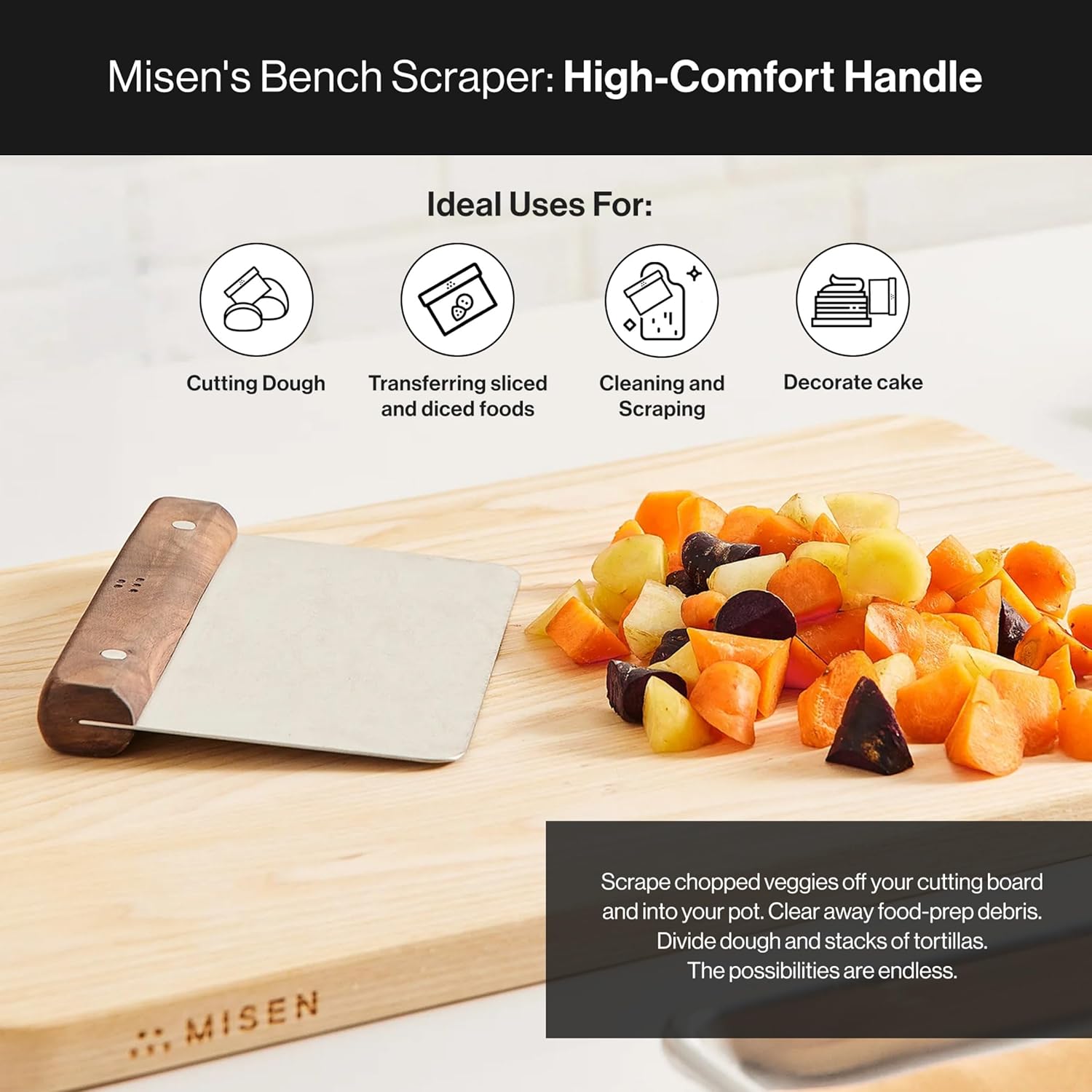 - Versatile Kitchen Companion for Effortless Meal Preparation: The Misen Bench Scraper is your go-to tool for a wide range of kitchen tasks. Whether it's scraping, clearing, or dividing, this versatile scraper effortlessly handles everything.