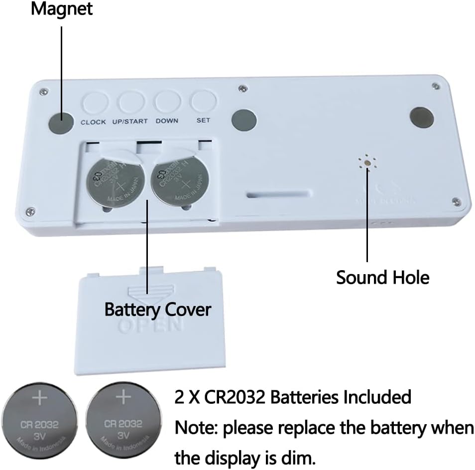 - ✔️Easy to Set: There are four buttons: SET, DOWN, UP/START and CLOCK. Two ways to place it. It has a little removable stand and 3 inset strong magnets at the back to stick on metal surface.