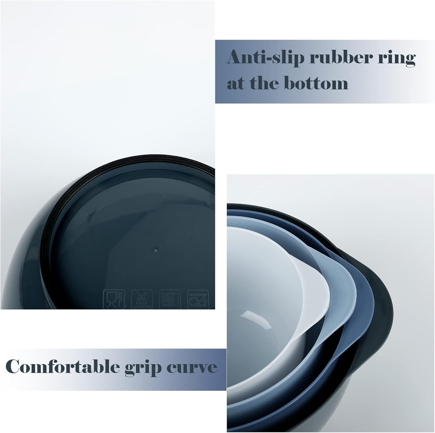 - [Non-slip & non-stinky] -The rubber layer at the base will keep these batter bowls from skidding or slipping during mixing. Ingredients won’t stick with the bowl’s non-stick surface, making lengthy mixing less tiring.