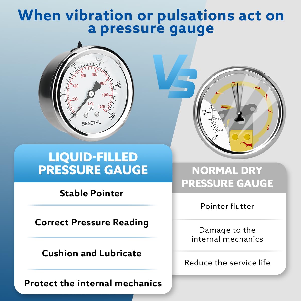 SENCTRL 0-200 Psi Glycerin Liquid Filled Pressure Gauge, 2.5" Dial Size, 1/4" NPT Back Mount, Stainless Steel Case, for Water Oil Pressure Test in Pipe Pool Pump Sand Filter Air Compressor