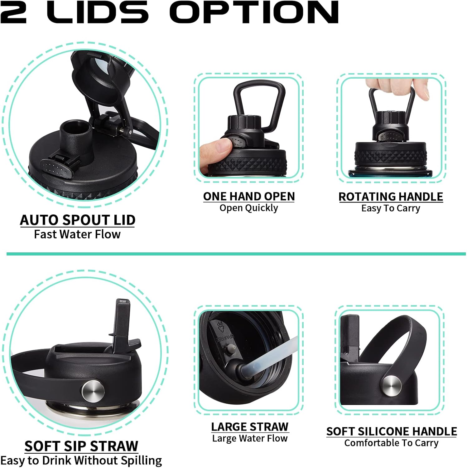 - 2 LEAKPROOF LIDS OPTIONS: The auto spout cap & straw lid provide your different drinking experience. The ONE-HAND operation pop-up spout lid for easy enjoy your fast water flow. The SPILL-PROOF straw lid with high flow rate & BPA free. Both 2 lids design with a sturdy handle, making the Hydrogen flask water bottle more convenient to carry
