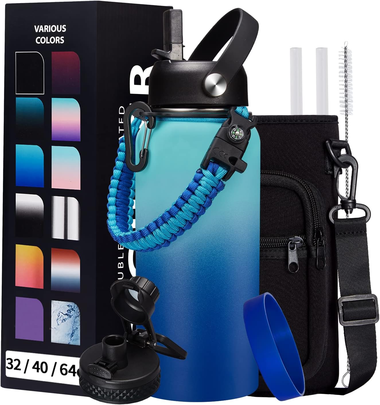 - SUPER JOYFUL COMBO: Buy 32oz insulated water bottles and get 9 accessories (2 x lids, 1 x survival paracord, 1 x carrying pouch, 1 x shoulder strap, 1 x protective cup mat, 2 x straws, 1 x straw brush). WITH A LIFETIME GUARANTEE, these thermal water bottles are perfect gifts for using at home, work, school, road trips, hiking, sporting events, or just hanging out