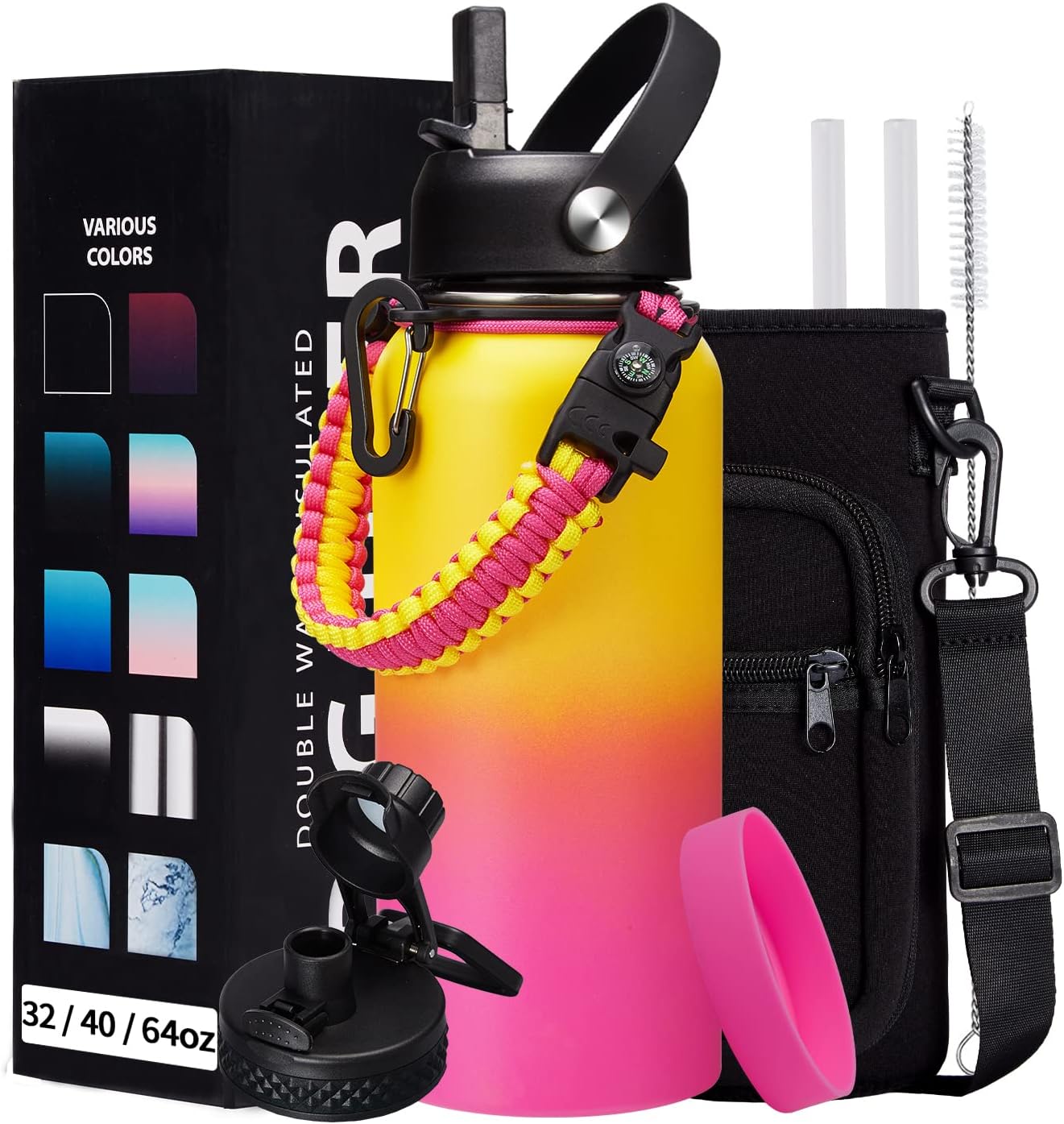 - SUPER JOYFUL COMBO: Buy 32oz insulated water bottles and get 9 accessories (2 x lids, 1 x survival paracord, 1 x carrying pouch, 1 x shoulder strap, 1 x protective cup mat, 2 x straws, 1 x straw brush). WITH A LIFETIME GUARANTEE, these thermal water bottles are perfect gifts for using at home, work, school, road trips, hiking, sporting events, or just hanging out