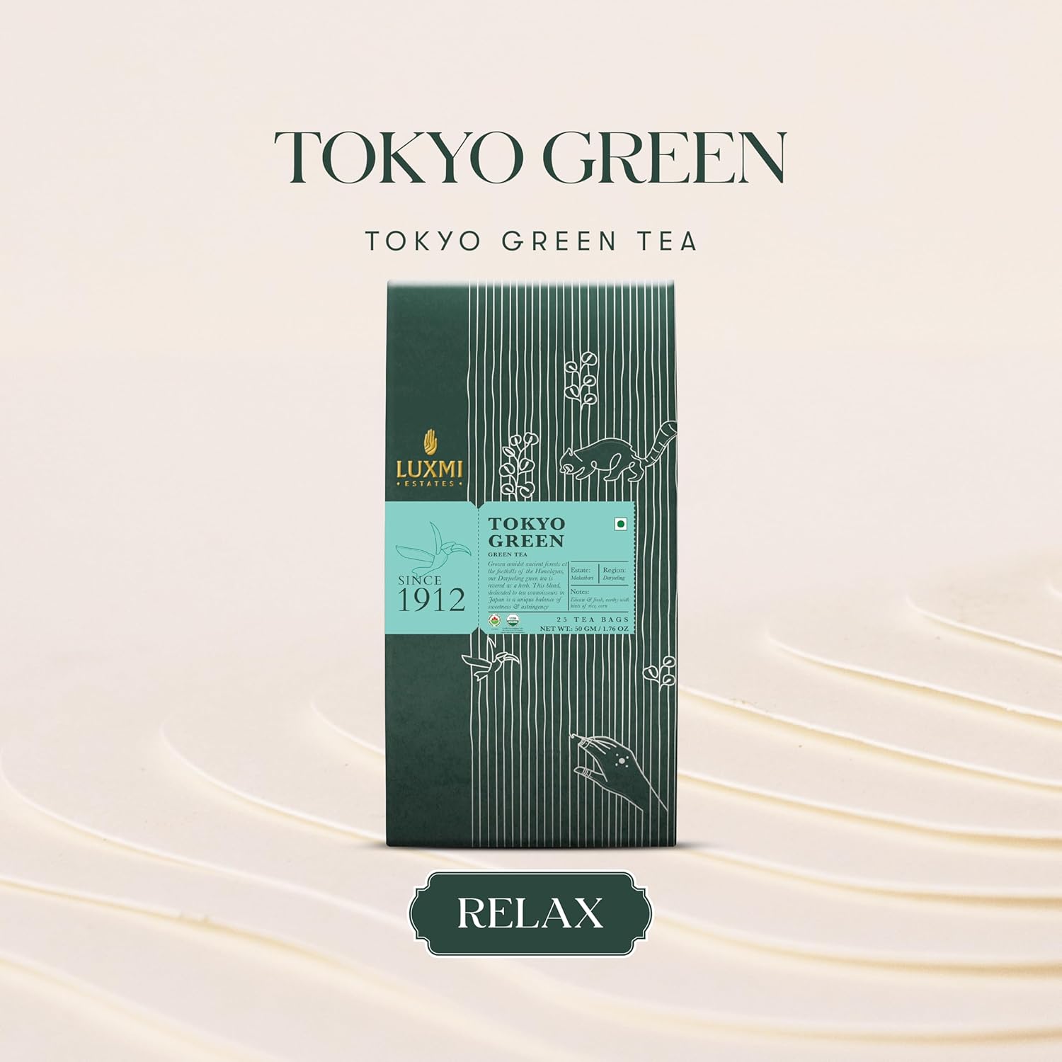 Luxmi Estates Tokyo Green Organic Green Tea (25 Tea Bags) Tea Bags For Relaxing, Calming, and Stress Relief, With Certified Organic Darjeeling Makaibari Green Tea