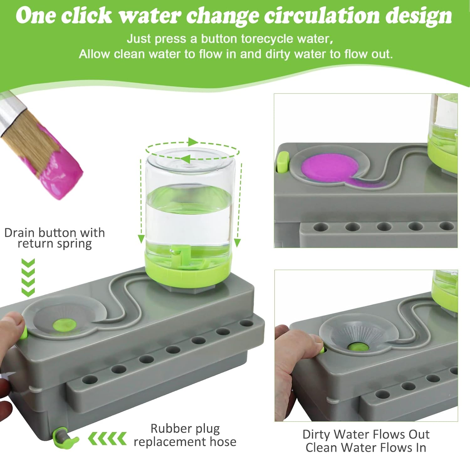 - 【2023 NEW PAINT BRUSH RINSER】No Water Leakage ! our paint brush cleaner are designed with enhanced Tap Water Circulation Design,just by pressing a button recycle dirty water and Automatic outflow of clean water to reuse.The anti-leakage function of our paintbrush cleaner is improved, there is no longer water leakage in use! Save time and effort,Focus on your artwork without interruptions.