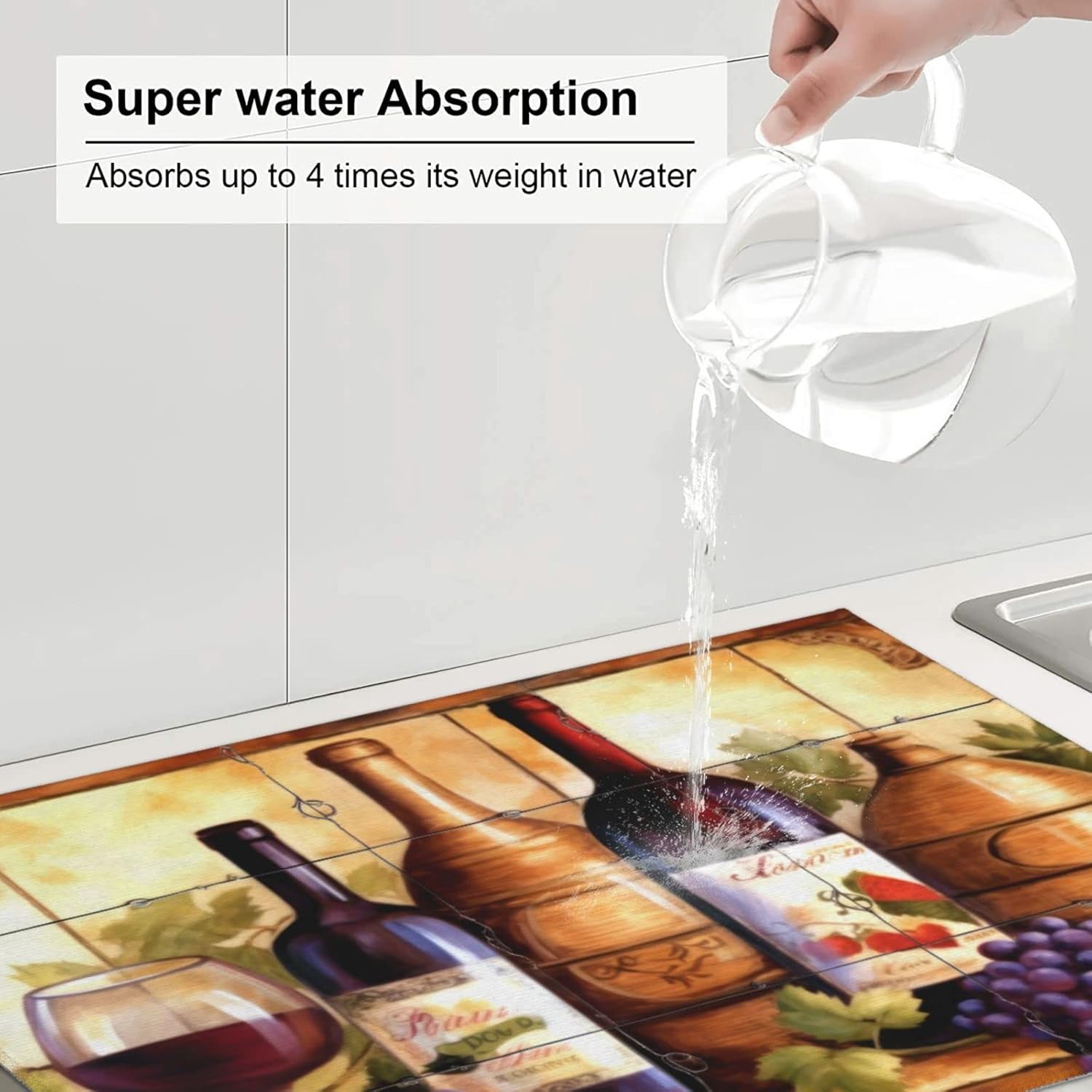 Large Dish Drying Mats For Kitchen Counter Microfiber Kitchen Drying Mat XL Draining Pad Absorbent Quick Drying Dish Mat 18x24 Inch - Wine Bottle Tile Mural