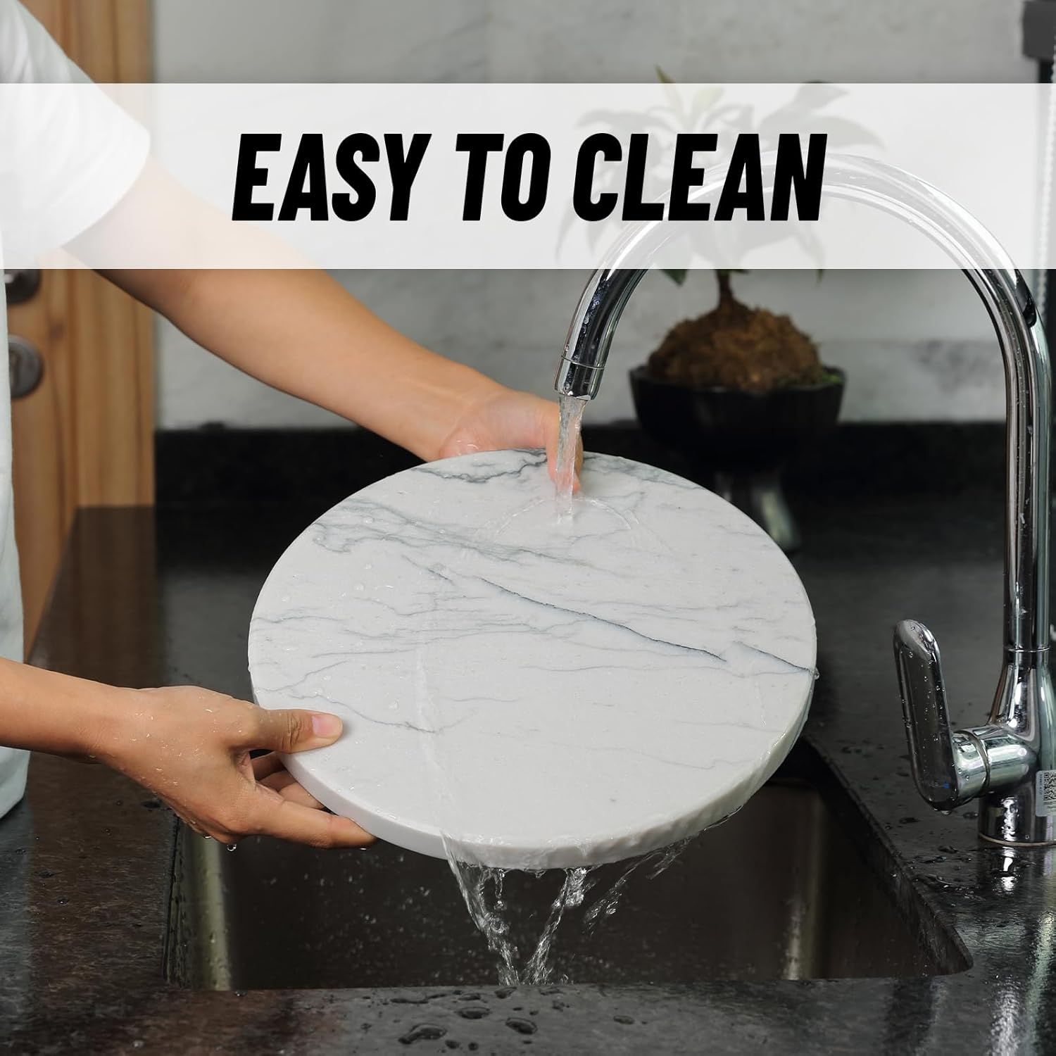 - KITCHEN ESSENTIAL: The unique marble cutting board serves as a highlight in your kitchen. Exquisite marble patterns and natural material elevate your kitchen into a stylish culinary space. While its non-slip feet securely hold the board in place during prep, helping to guard against injury, its convenient non-stick surface allows for the easy rolling of dough, pastries, and fondant with a minimal amount of flour. It's even great for chocolate tempering and serving cheese!