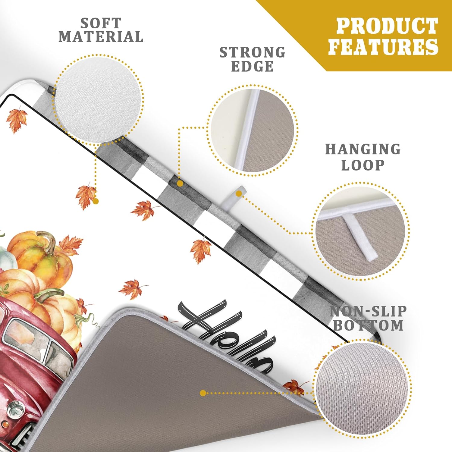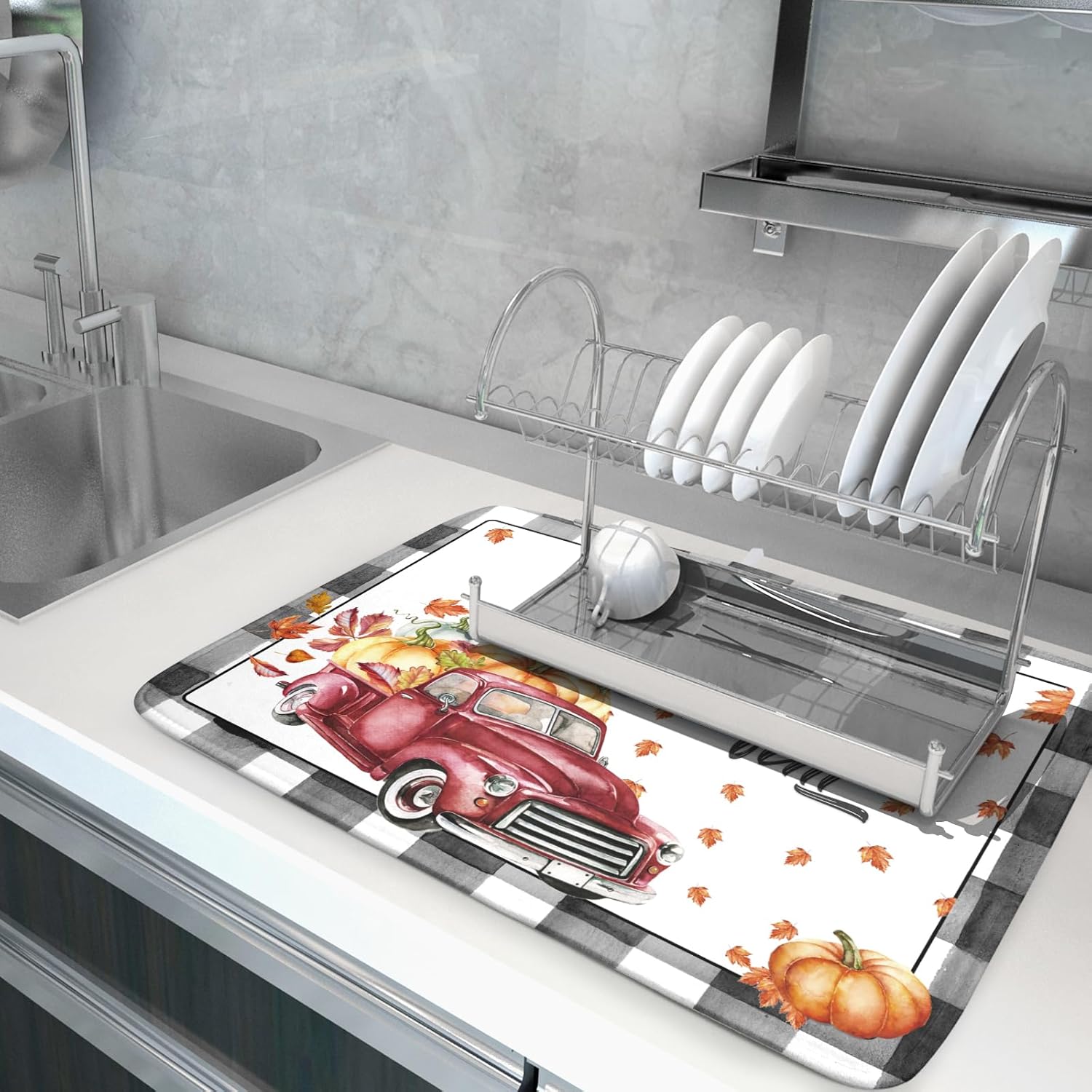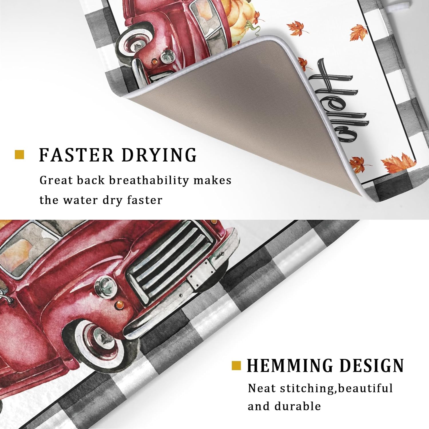 Hello Fall Pumpkin Dish Drying Mat for Kitchen Counter Decor 18x24 Inch Red Truck Harvest Absorbent Reversible Microfiber Dish Drying Pad Buffalo Check Plaid Dish Drainer Rack Mats for Coffee Bar