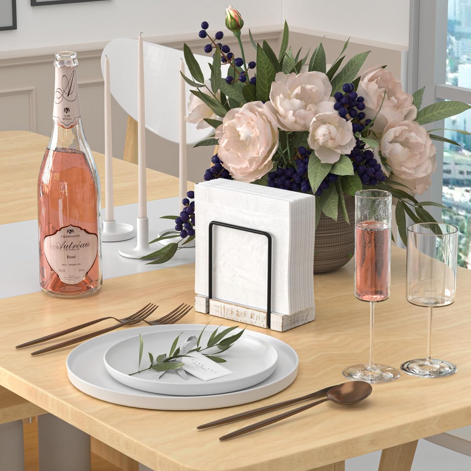 Napkin Holder for Table, Wood Iron Standing Napkin Dispenser for Dining Table Farmhouse Cocktail Picnic Rustic Wood Holders All Kitchen Dining Room Decor Black & Farmhouse White