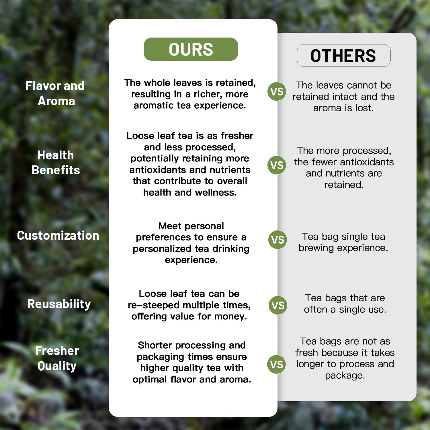 - Strict of materials: We know how important the quality of tea leaves is to a cup of high-quality tea. We harvest fresh, high-quality tea leaves to craft our products to ensure that every customer chooses to enjoy our tea with confidence