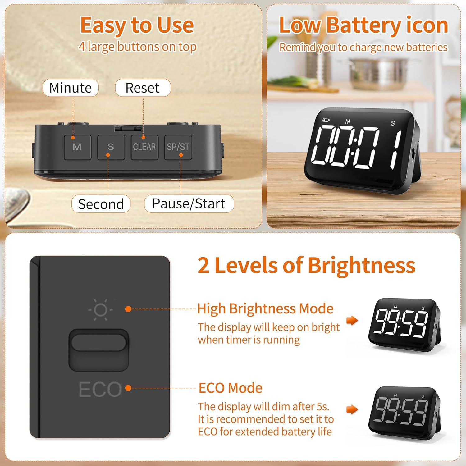 - 2 Levels of Brightness and Volume - Two slide switches for you to choose the brightness (Bright/ECO) and volume level: Loud: 80-90dB, Soft: 60-75dB, Mute (only time blinks) you prefer, which is ideal for you to use in any occasions. NOTE: When it is set the Loud or Soft, the timer would also beep when you set time. Please slide it to Mute as you need