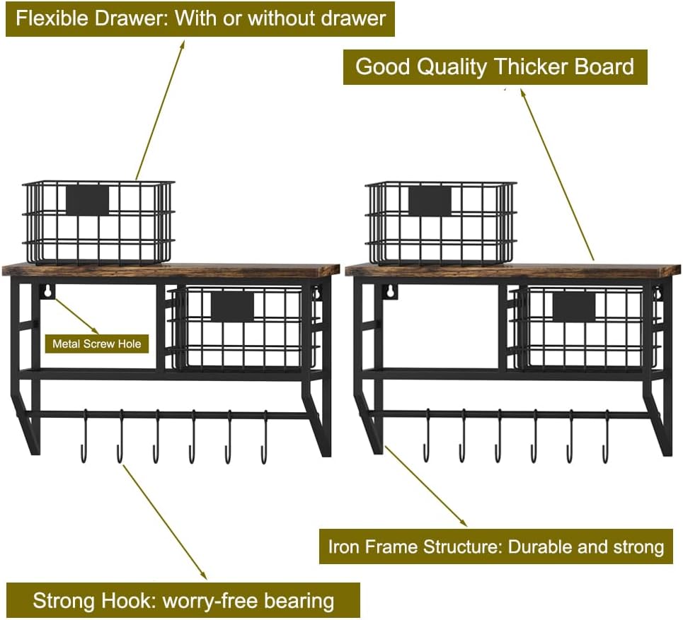 - ăSave SpaceăThis 16in wood floating shelves with baskets is a charming decoration, will not occupy much place of the home. On the contrary, this wall storage organizer will create more storage space for you, can be combined with the fitment style of the home and placed in many venues like kitchens, bathroom, farmhouse and bars, garage, above toilet etc, any other where you want to install, Perfectly saves you space.
