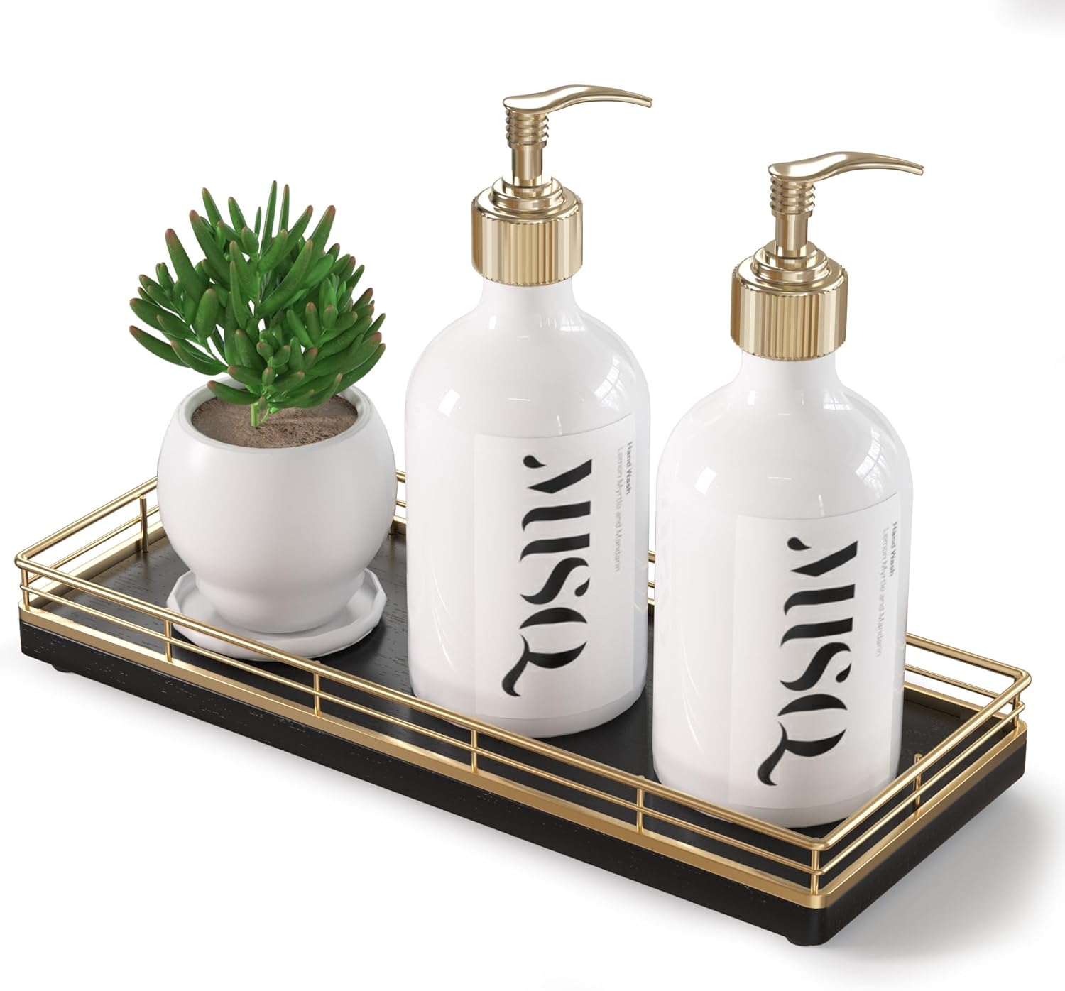 - Versatile Functionality: Elevate your daily routine with our bathroom counter tray; Neatly arrange bathroom essentials like soap, toothbrushes, cotton swab and lotions, keeping your countertop tidy; Add a touch of elegance to your dresser by using the vanity tray to showcase perfumes, jewelry, and cosmetics; Impress your guests with neatly arranged hand towels and toiletries presented on the small tray or use it as a toilet tank tray