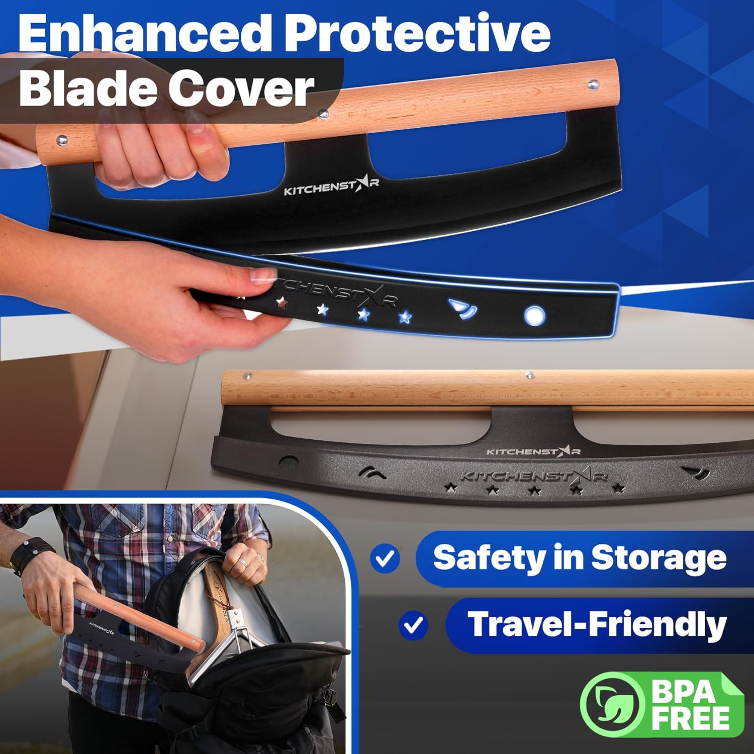 KitchenStar 14-Inch Pizza Cutter Rocker Blade - Razor Sharp Stainless Steel Slicer Knife, Stylish Beech Wood Handle, Protective Cover - Professional Pizza Oven Accessories, Black