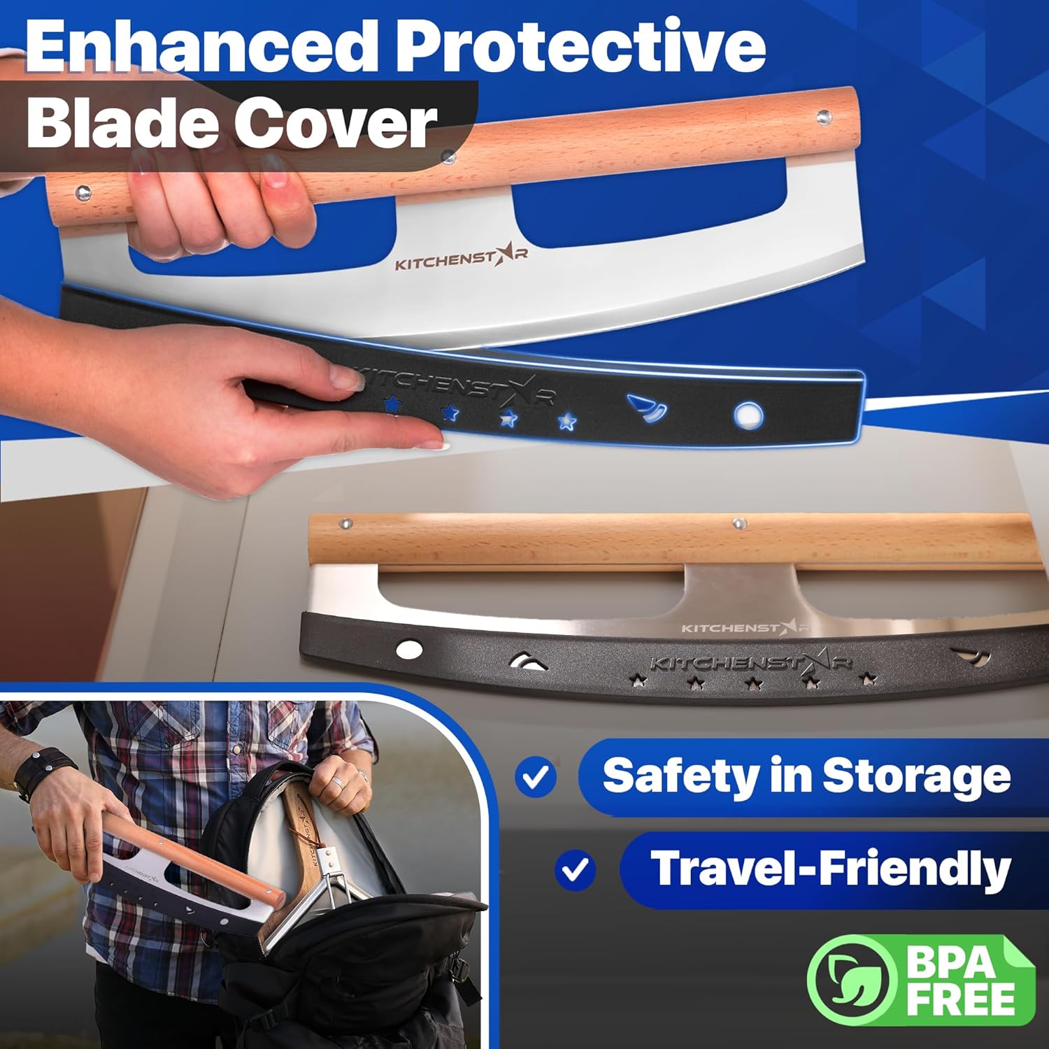KitchenStar 14-Inch Pizza Cutter Rocker Blade - Razor Sharp Stainless Steel Slicer Knife, Stylish Beech Wood Handle, Protective Cover - Professional Pizza Oven Accessories, Silver