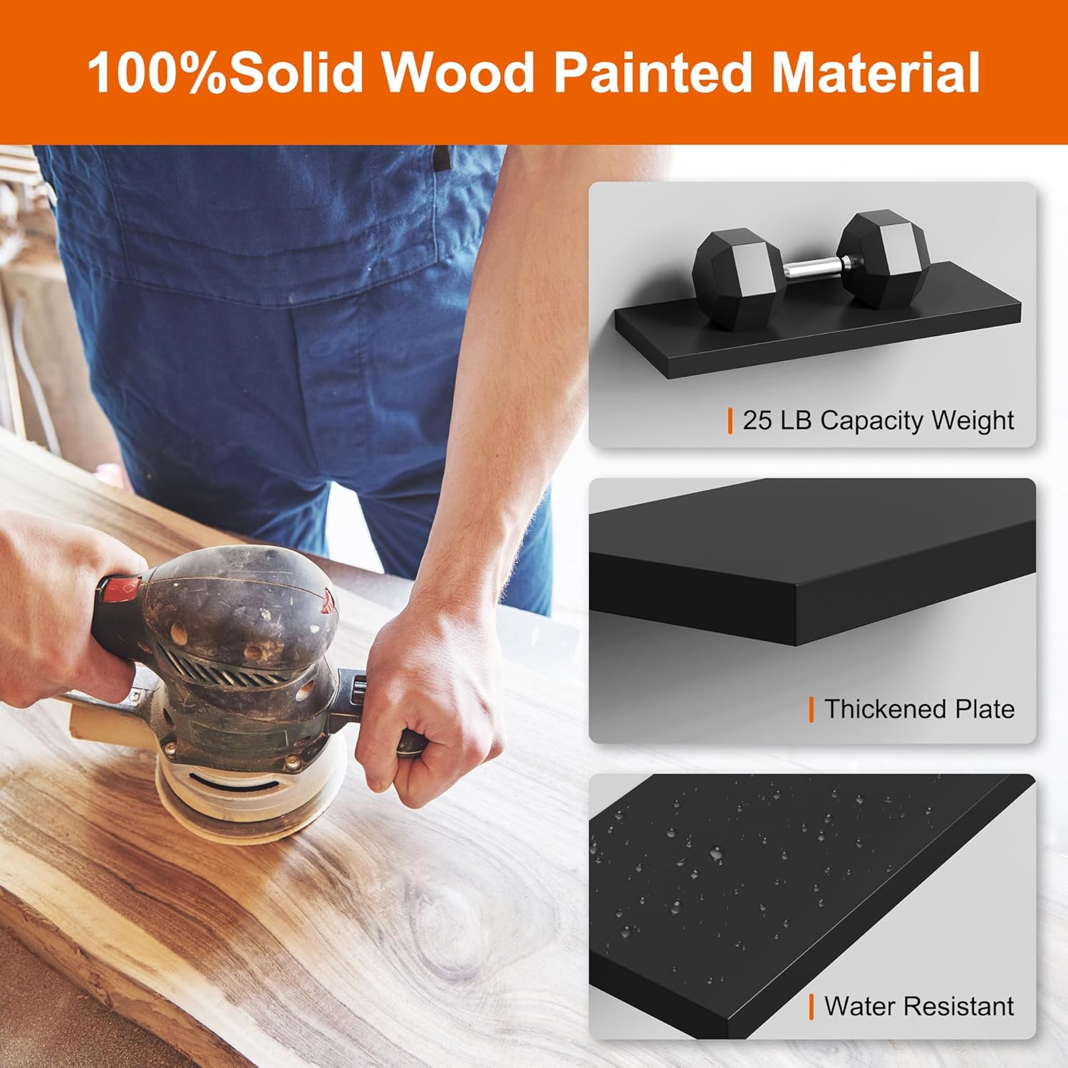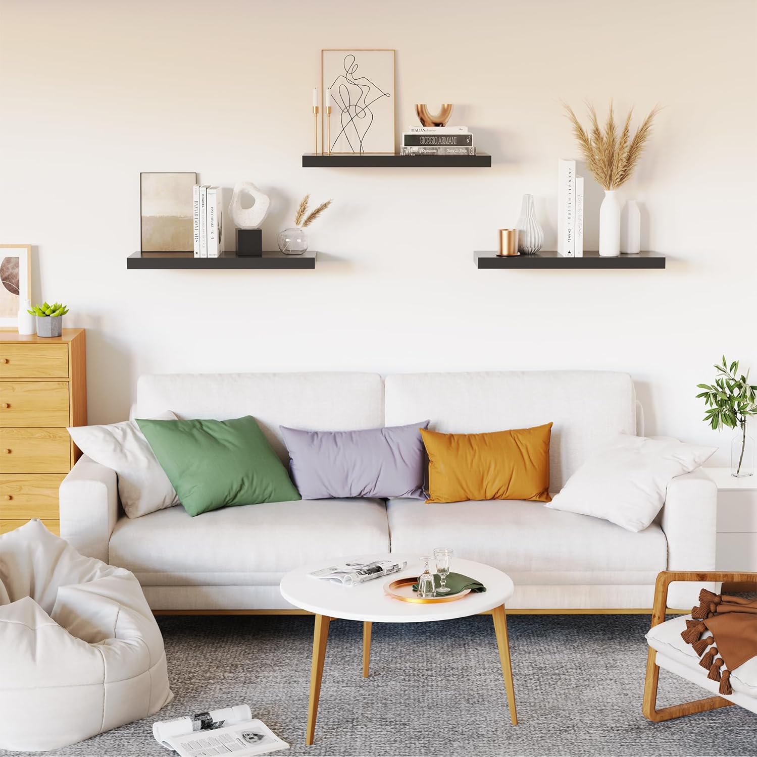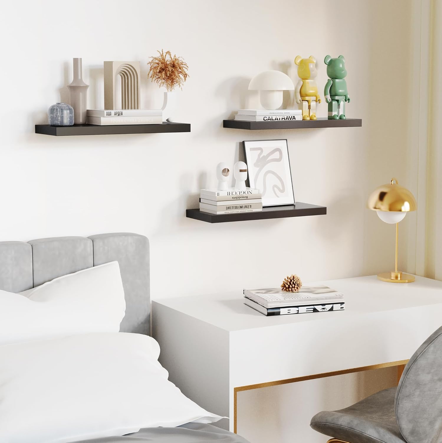 - ăModern Concise DesignăOur black floating shelves are designed with modern simplicity. It has streamlined look to bring modern style and vintage atmosphere to the home. Our wood floating shelves for wall is a set of 3 wall mounted shelves. Our rustic wood shelves can give us plenty of space for creativity, we can choose a line, a ladder shape, or a symmetric way. Let our floating shelf wood more suitable to the home decor and bring a better visual experience.